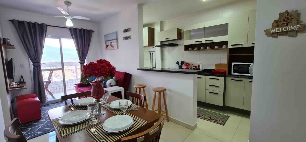 Apartamento espaçoso 250 m2 com 3 Vagas de Garagem na Vila Tupy. Segurança 24 horas e sistema de câmeras. WI-FI 4 dormitórios com ar-condicionado e ventilador, Ampla sala,varanda de FRENTE PARA O MAR, Mesa de jantar,acomoda 12 pessoas em camas. . Ótimo espaço para fazer um churrasco com sua família/amigos e se refrescar na sua piscina privativa. Completo com camas, cozinha, utensilios,geladeira,fogão,microondas, ,lavanderia,etc próximo a padarias, supermercados e farmácias.