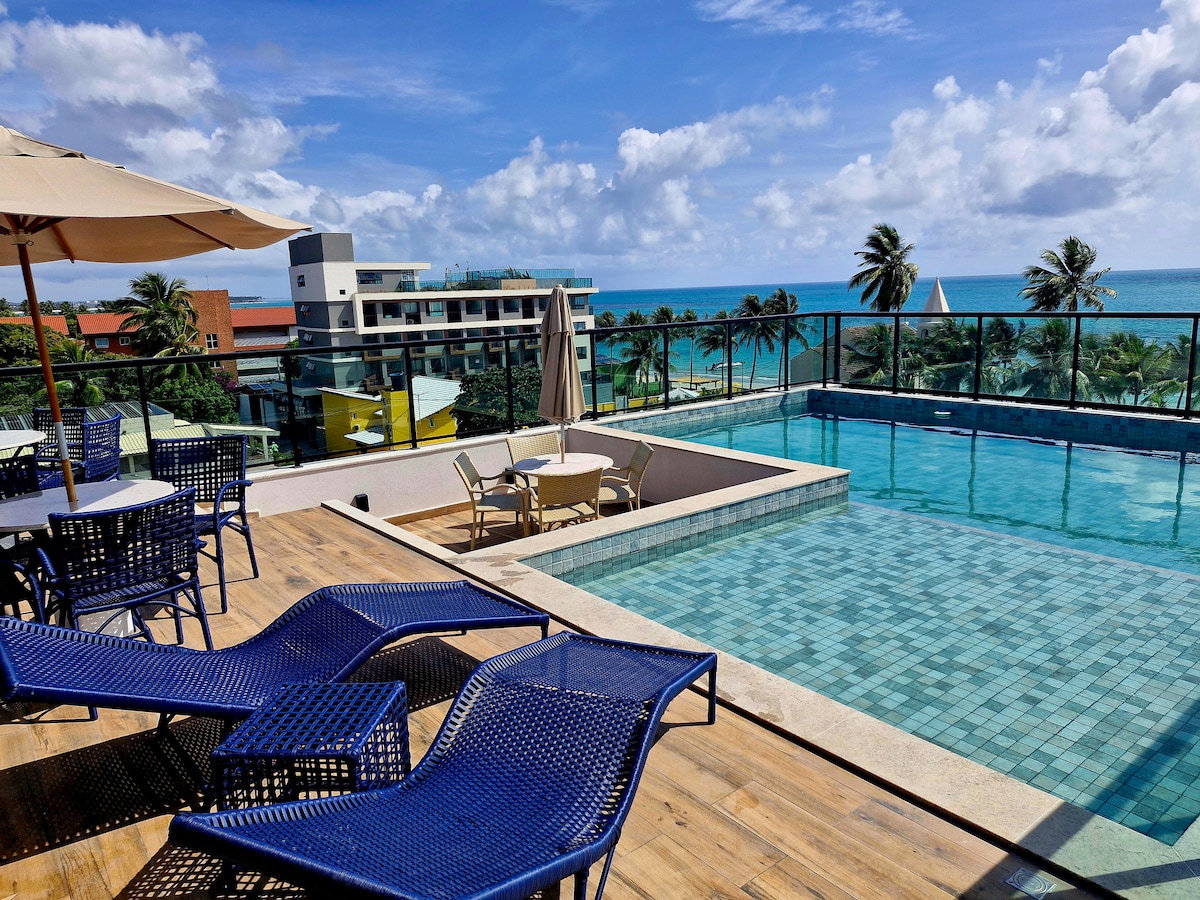 ✔️Flat no 3°Andar em frente ao mar a 20 passos das areias da Praia e apenas 9 minutinhos caminhando até a Famosa Rua das Sombrinhas, que fica no Centrinho (Vilinha) de Porto de Galinhas. ✔️Varanda privativa com vista para o mar, ar condicionado, smart tv 55", piscina, academia, estacionamento rotativo. ✔️Ideal para até 3 pessoas, casais, roupa de cama e toalhas de banho são fornecidas. ✔️Veja o nascer do sol sem sair da cama, em dias de céu aberto e conforme a estação do ano.