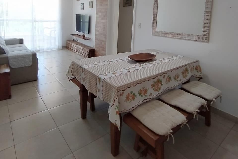 Apartamento mobiliado com 2 quartos com ar condicionado, sendo 1 suite, na praia da Bacutia a 100 metros do mar. O prédio possui piscina, churrasqueira, sauna, sinuca, totó e tênis de mesa. Apartamento com Wi-Fi, interfone, gás encanado e 01 vaga de garagem. Prédio com 2 elevadores e portaria 24 horas. Há toalha de rosto e roupa de cama disponíveis aos hóspedes. NÃO HÁ toalha de banho disponível.