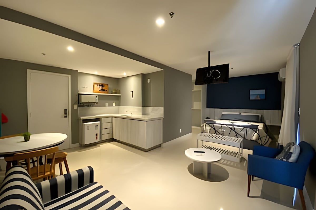 Nossa acomodação foi projetada para que você tenha muito conforto e praticidade em sua hospedagem! O flat 401 é apartamento da linha luxo, com 38 m² que possui como diferencial uma varanda ampla com vista para o canal Itajuru.Fica há 100 mts do centro gastronômico com diversos restaurantes,bares com música ao vivo e há 700 mts da Praia 🏖️ do Forte.Já com estacionamento coberto incluso no próprio Prédio .