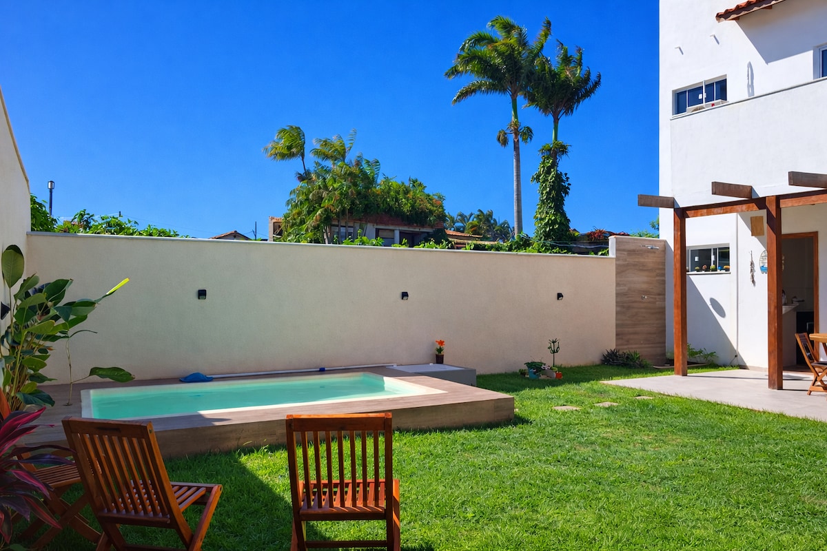 Casa de 47m toda reformada com sala, quarto, cozinha e banheiro, para até 4 hóspedes em um condomínio com cara de pousada: jardim, piscina recém reformada, sauna, sala de jogos, quadra, wifi de 300Mb para home office, segurança 24h e estacionamento. Ideal para familias que desejam desfrutar de um espaço lindo a 5 minutos andando até a Praia de Geribá na altura do Bar Fishbone.