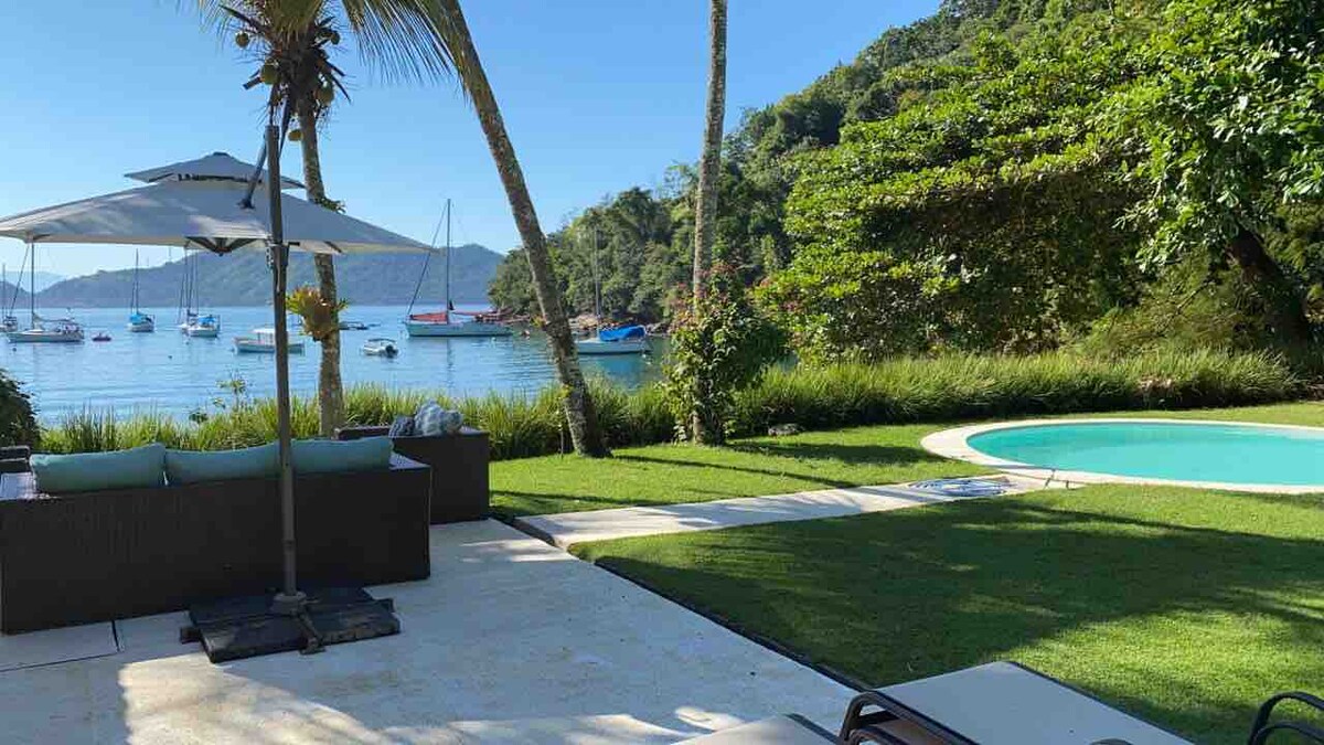 A place with the most incredible view of the sea, views of Flamengo Bay, Anchieta Island, Santa Rita Beach, Lamberto, Ribeira and others… With a private trail in the Atlantic Forest, 2 incredible viewpoints, small waterfalls with crystal clear water! With security and privacy, the Greece-themed house has a comfortable and structured 300m2, airy and fresh and with new air conditioning in all bedrooms. The closest beach is Lamberto Beach, you have to walk 400m, but we recommend going by car!