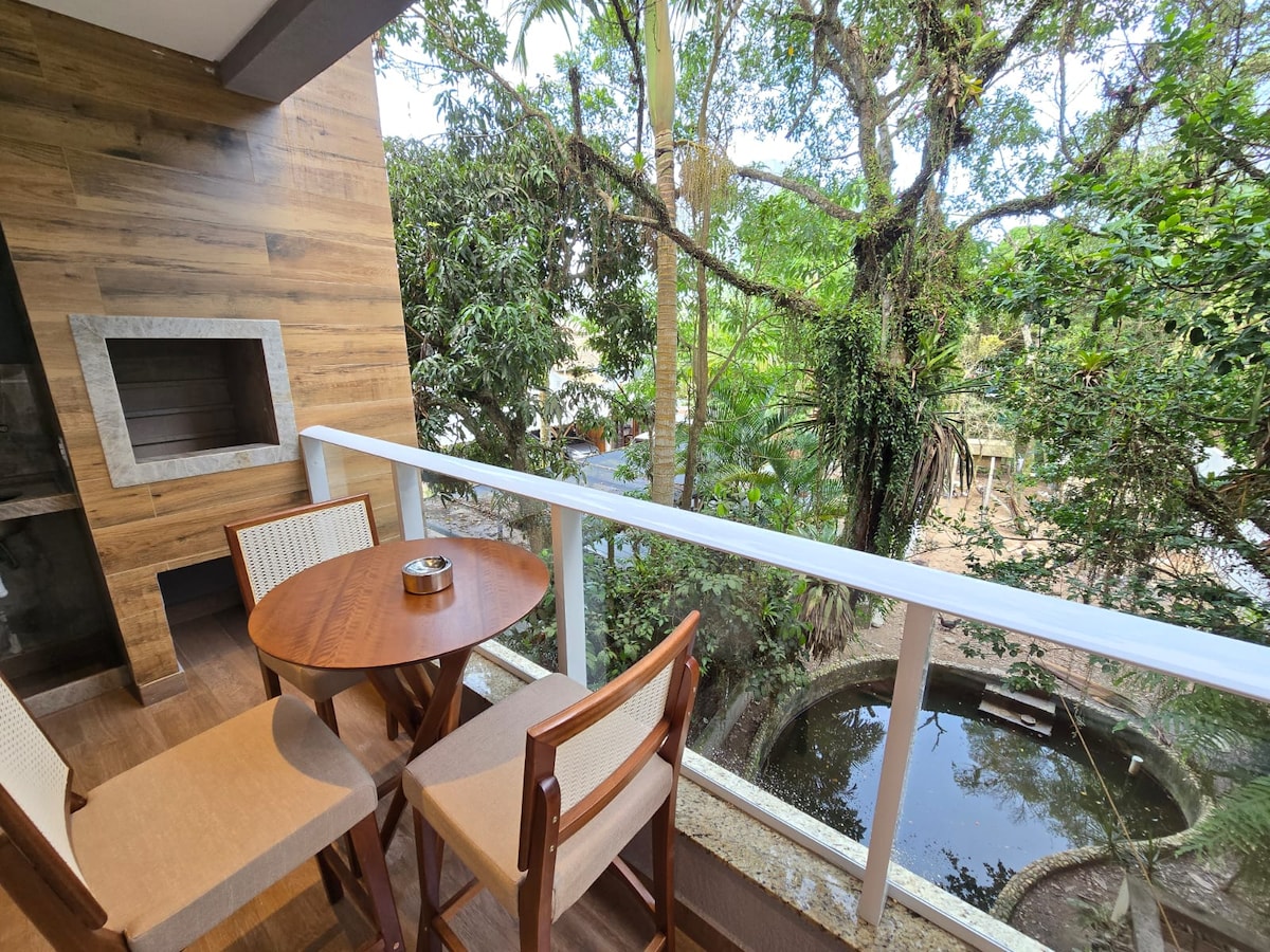 Apartamento com linda vista de Bombinhas, Bombas e Porto Belo. Apto de 1 quarto (casal - cama queen size), cozinha completa, banheiro, sala e sacada c/rede. Moderno, decoração clean, ar condicionado e TV led. A propriedade possui pátio, piscina, churrasqueiras e há 1 vaga de estacionamento (compartilhados). Ficamos 5min a pé das praias: Lagoinha, Sepultura e Retiro dos Padres, zona tranquila e segura, 15 min a pé do centro de Bombinhas. Acesso a cobertura por escadas.