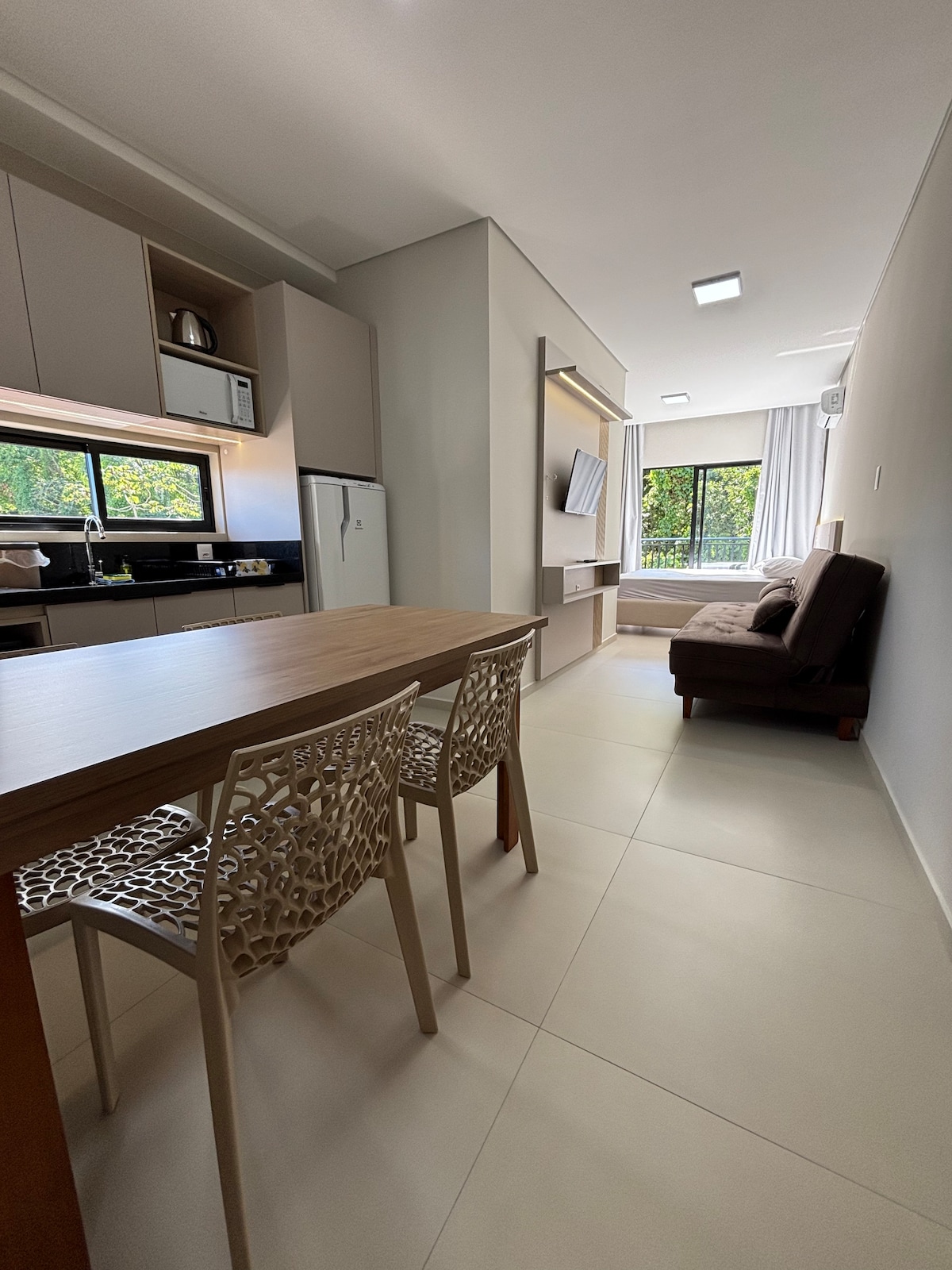 Enjoy the wonders of Santa Catarina! In this beautiful studio, perfect for relaxing and enjoying your vacation, just a few steps from the stunning Bombinhas Beach. Located in the city center, you’ll have easy access to natural beauty and the vibrant nightlife, with amazing bars and restaurants around. With integrated, air-conditioned spaces, it accommodates up to 3 people, ensuring all the comfort for a perfect stay. Live this unique experience, book now!