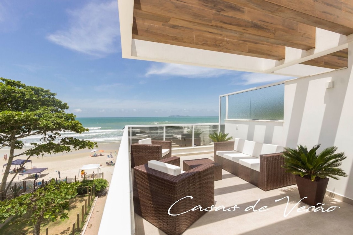 Feet in the sand. House accommodates 8 people in beds, 3 with single mattresses. Seafront house with 4 suites in Bombinhas, ideal for families and groups. It offers comfort, privacy and a privileged location, with direct access to the beach. Modern spaces, fitted kitchen and balcony with stunning views. Close to restaurants, shops and local attractions, it is the perfect setting for an unforgettable vacation on the Santa Catarina coast. Book now and enjoy the best of Bombinhas!