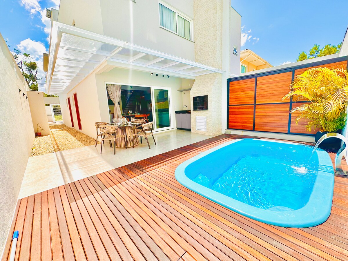 Geminado 2, TOTALMENTE NOVO. Localizado na belíssima praia de Mariscal em Bombinhas SC. Casa de 2 andares, sendo o andar térreo com sala, cozinha, banheiro externo, lavabo, piscina e área de festa com churrasqueira. Andar superior com 3 suítes e camas box. Casa localizada à 350m da praia de Canto Grande. A casa ainda dispõe de um portão/divisória que se abre e pode se unificar na área de lazer com o Geminado 1, podendo hospedar famílias maiores. Ar-condicionado em todos os ambientes, net e tvs.