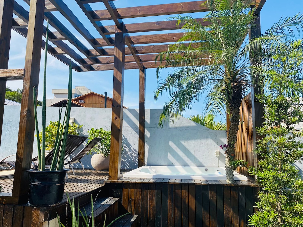 Relaxe com toda a família nesta acomodação tranquila dentro do residencial Morada do Ganso,a casa fica entre as praias Lagoinha e Sepultura na zona nobre de Bombinhas.Casa recém reformada e mobiliada,5 quartos, sendo 3 suites casal e 1 suite queen,toda mobiliada,cozinha completa de primeira linha, roupas de cama brancas, jacuzzi com vista incrível para o mar,lavanderia, Smart Tv, wi-fi, adega, geladeira duplex,vaga para 2 carros. No condomínio tem piscina compartilhada, ducha pós praia e jardim.