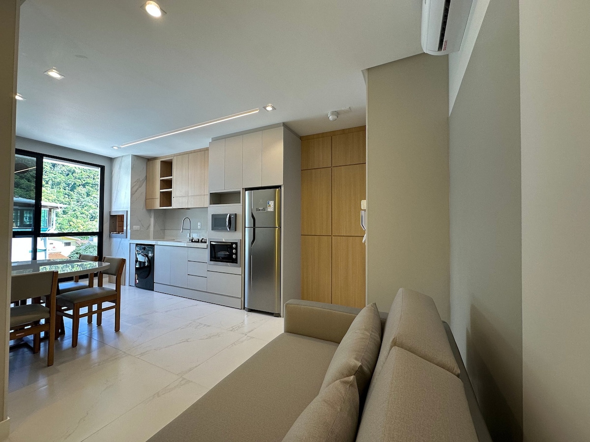 Modern and cozy apartment located in Residencial Sunny Flats, approximately 400 meters from Bombas beach in Bombinhas. It has a beautiful outdoor area with a swimming pool on the terrace, gourmet area, fire pit, games room, and kids' area. It has an integrated living room and kitchen with a dining table, a guest bathroom, 1 air-conditioned bedroom, a sofa bed in the living room, and a balcony with a private barbecue.
