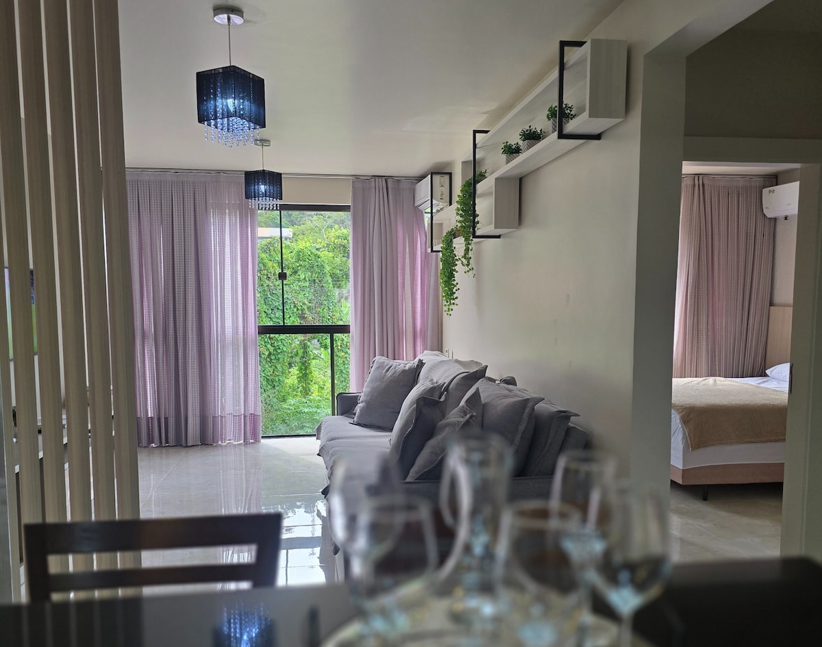 Stay in an apartment 350m from Mariscal beach in Bombinhas, close to nature, in an environmental conservation area. Beautiful fit for couples, equipped with full kitchen, dining table, bedroom with air conditioning and views of the backyard. Located at Condominium Villa Esmeralda, you will find tranquility and rest amidst nature. A perfect place for those who want to enjoy the idyllic scenery of the coast of SC.