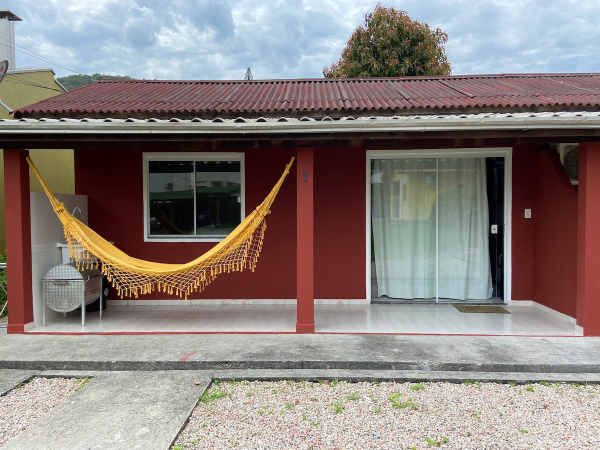 Estamos integrados à natureza, cercados por arvores, pássaros, borboletas. Mini casa com entrada independente e área de jardim na frente da casa de uso exclusivo. O estacionamento é de uso comum com outras unidades. Estamos aprox 650m da praia de Bombas e passarela do Ribeiro. Localização conveniente a uma quadra da padaria, mercado e farmácia, no centro de Bombas, a 150m da sede da Prefeitura de Bombinhas
