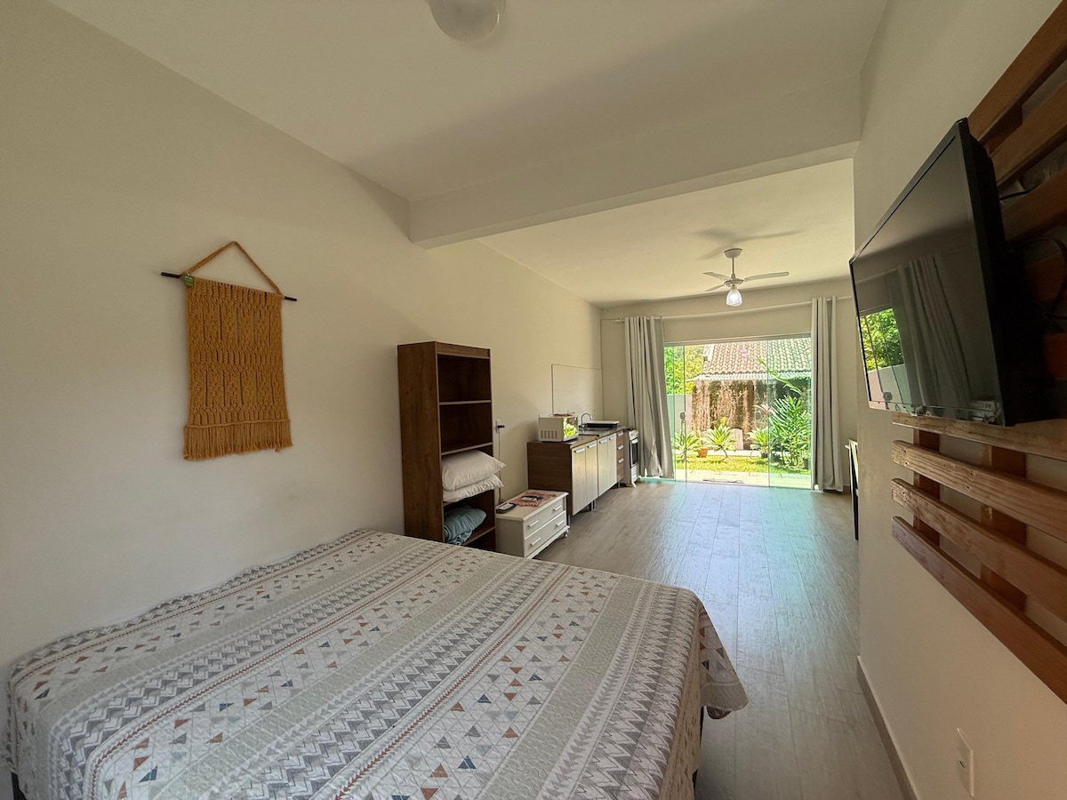 Suíte monoambiente quarto e cozinha. Banheiro. Apenas 80 metros da Principal Praia de Bombinhas. Nosso endereço é Rua Salema, 29. Aqui você fica pertinho das melhores praias, Bombinhas, Prainha, Embrulho, Lagoinha, Sepultura, Retiro do Padres e Quatro Ilhas! Tudo para fazer caminhando! Oferecemos aos nossos hóspedes máscara de mergulho, cadeiras e guarda-sol.