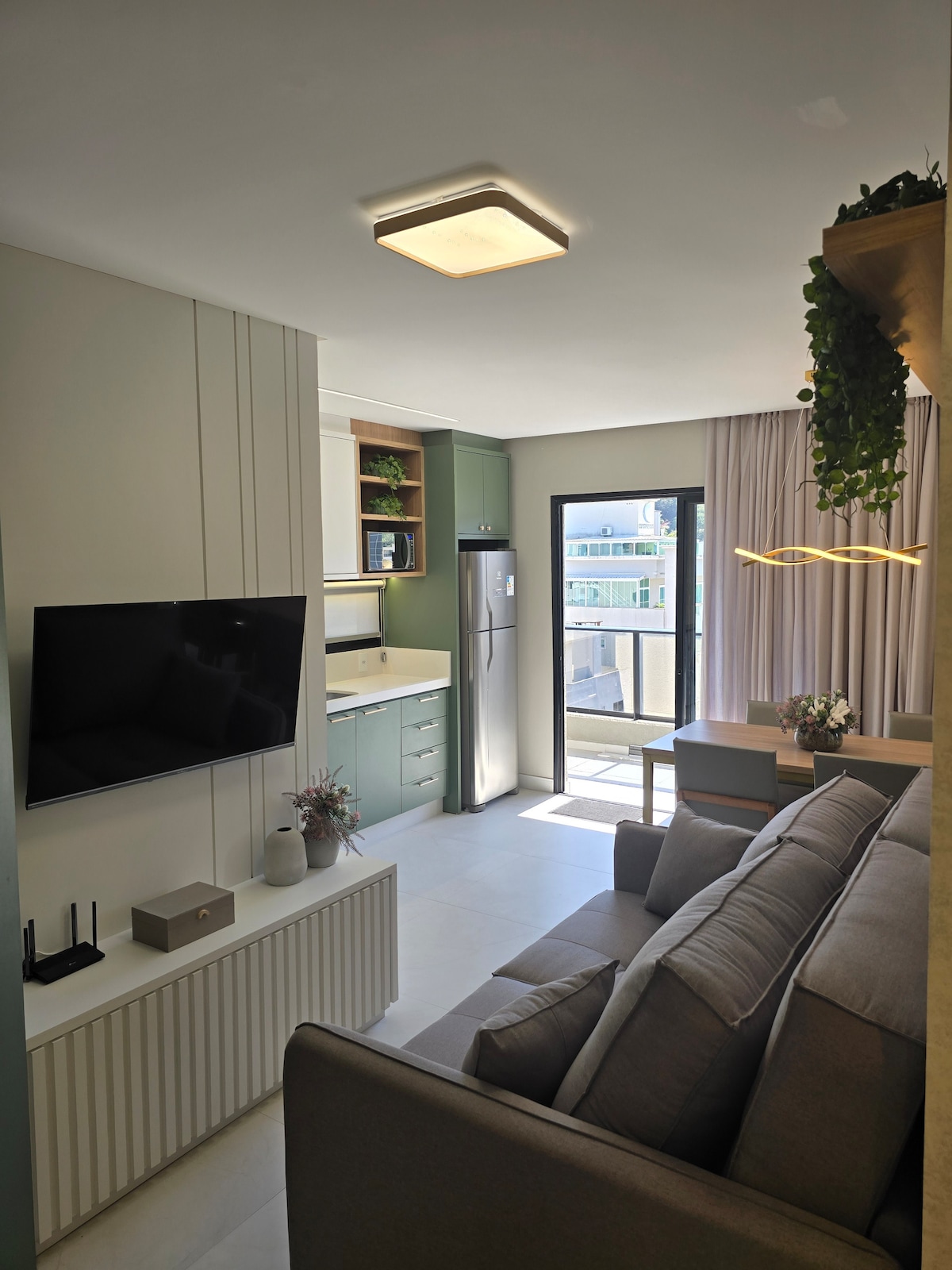 Apartamento com linda vista de Bombinhas, Bombas e Porto Belo. Apto de 1 quarto (casal - cama queen size), cozinha completa, banheiro, sala e sacada c/rede. Moderno, decoração clean, ar condicionado e TV led. A propriedade possui pátio, piscina, churrasqueiras e há 1 vaga de estacionamento (compartilhados). Ficamos 5min a pé das praias: Lagoinha, Sepultura e Retiro dos Padres, zona tranquila e segura, 15 min a pé do centro de Bombinhas. Acesso a cobertura por escadas.