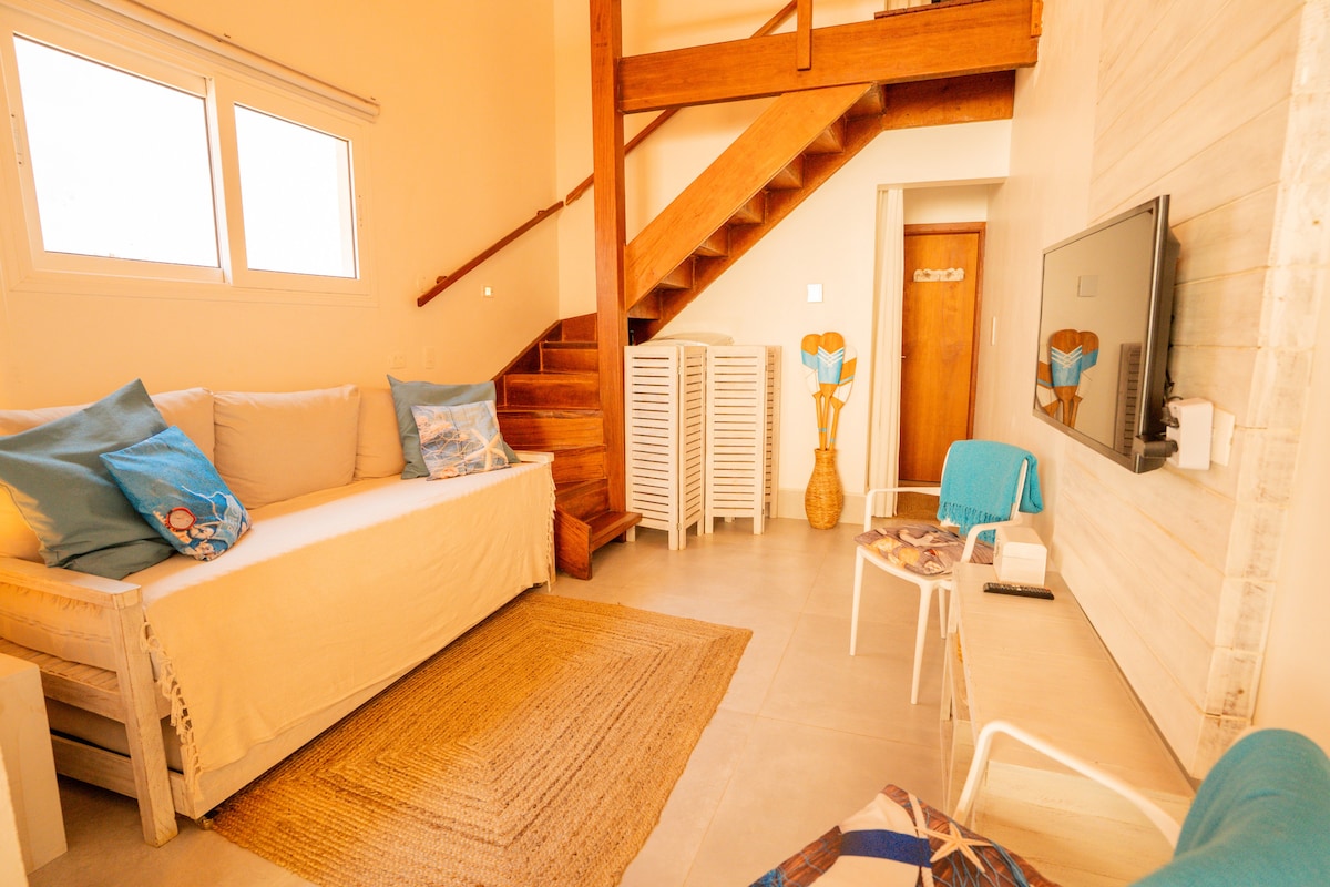 Casa d’Aroeira Condomínio Boutique casadaroeira.🍃 Flat novo duplex Aproximad. 55 mts2 Serviço de praia portão 1 2 quartos c/ cama casal padrão (1.38x1.88 cm) 2 banheiros Sofá cama solteiro na sala Sala jantar integrada c/ cozinha TV/Ar Cond. quartos e sala 2 quadras do mar No centrinho perto de tudo Roupa cama 600 fios algodão egípcio Toalhas banho/praia 1 vaga p/ carro Cozinha completa/utensílios novos Chuveiro alta pressão Secadora e centrífuga roupa Não temos piscina ou churrasqueira