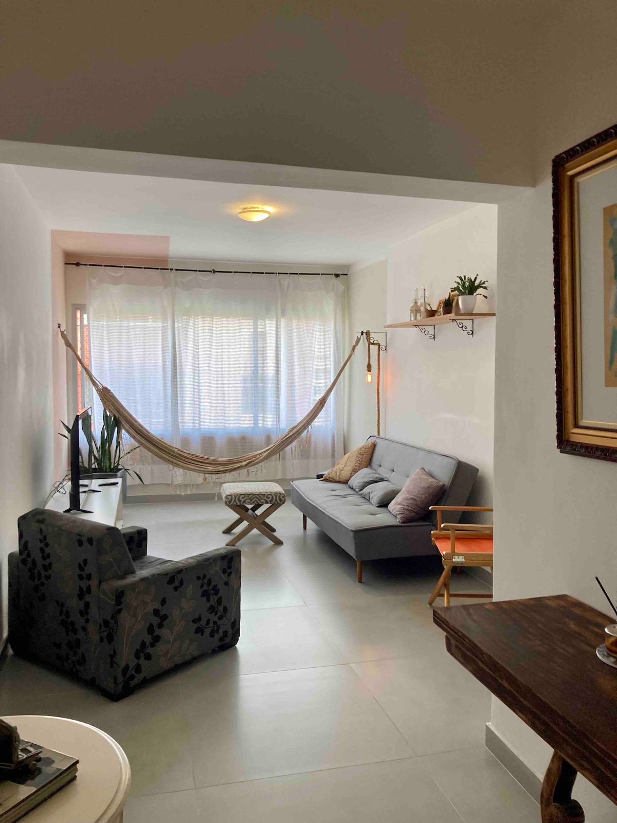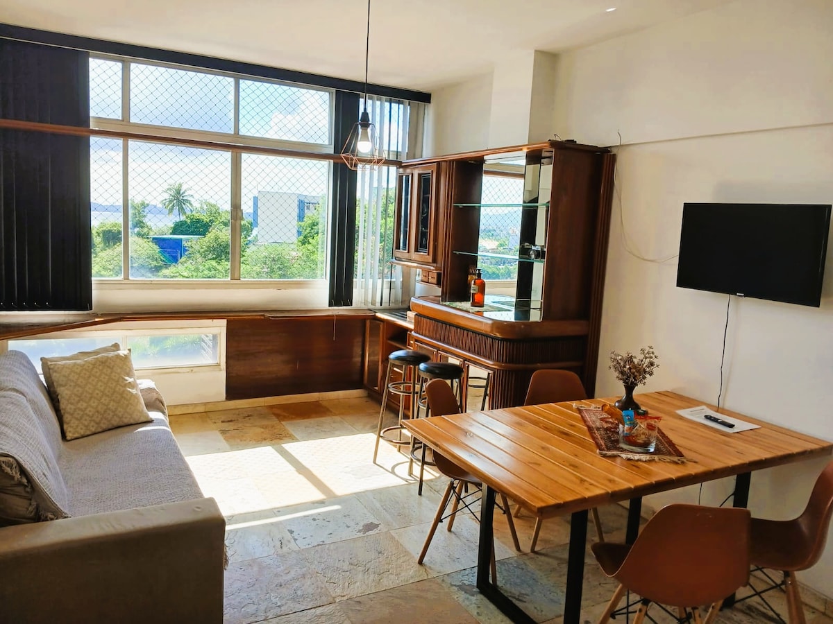 O apartamento charmoso de localização excelente, perto da praia, restaurantes e de tudo que é preciso! Uma sala ampla com luz natural; cozinha equipada; três quartos, uma suíte com cama de casal, um quarto com duas camas de solteiro e um terceiro quarto com um beliche.Todos os quartos tem ar-condicionado Split; escrivaninha para home office, ofertemos roupas de cama e banho ; pequena área de serviço com máquina de lavar é pet friendly e estamos dispostos a ajudar no que precisa.