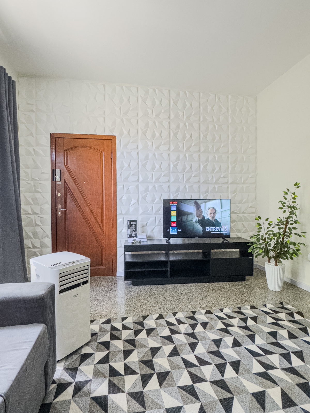 Ar condicionado Split nos 2 quartos; TV em todos os cômodos (na sala de 55" com HBO Max e Prime Video e TV nos 2 quartos de 50" e 40") 3 quadras do Mar/Orla de Itaparica (7 minutos a pé) Garagem Frente do condominio tem farmácia, padaria, restaurante, pizzaria 3 supermercados grandes a 700m 3 ventiladores de teto (2 quartos e 1 sala); 1 colchão casal queen; 1 colchão casal normal; secador de cabelo; cafeteira eletrica; liquidificador; Airfryer, rack para trabalho; cadeira escritório