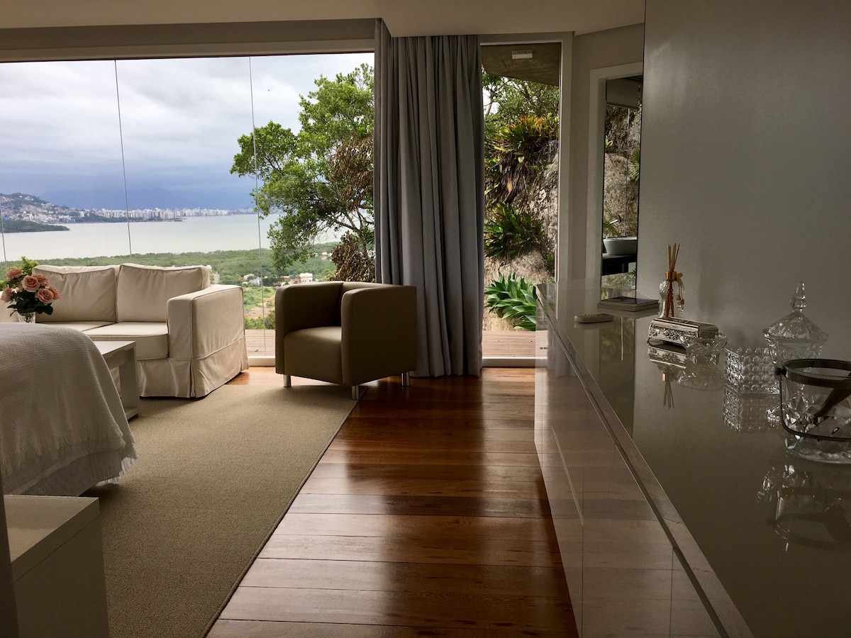Está suite Master pertence a uma casa de 980metros quadrados, ela tem 120 metros quadrados no total , uma vista deslumbrante e inesquecível, rodeado pela mata atlântica e total vista do mar Paz e conforto em uma cama super king , lençóis e toalhas da trussard , mesa de café da manhã reversível, mini copa com frigobar e utensílios para café da manhã . Tem uma jacuzzi privativa , várias varandas e decks . Agua potável nas torneiras Está é a nossa melhor suite , um lugar encantador e único❤️