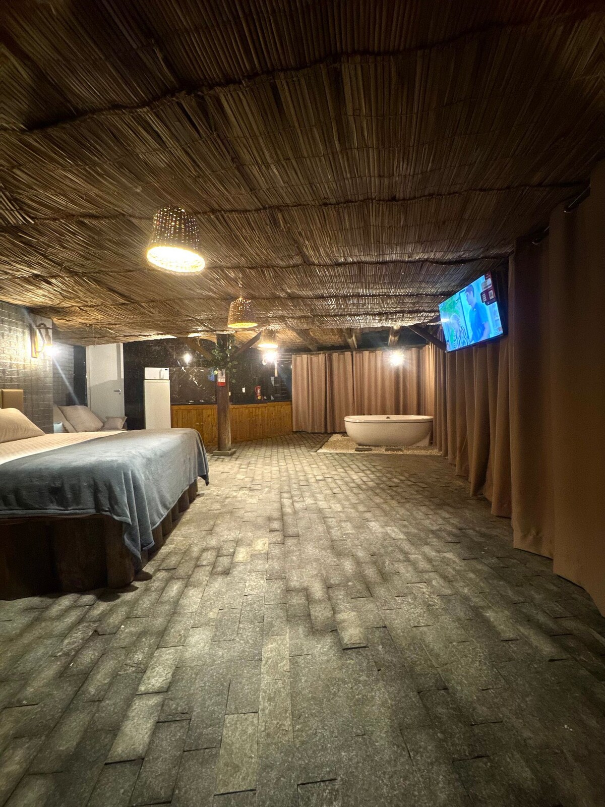 O chalé é totalmente equipado para uma estadia confortável e inesquecível: Quarto • Quarto aconchegante com sacada e vista para o pôr do sol Sala • Sofá confortável para relaxar depois da praia • Smart TV • Ar-condicionado Cozinha completa • Utensílios para preparar refeições completas Banheiro • Chuveiro com aquecimento a gás Relaxamento • Banheira de hidromassagem para momentos de descanso a dois À noite, o clima é silencioso com céu estrelado e a brisa suave vinda do mar.