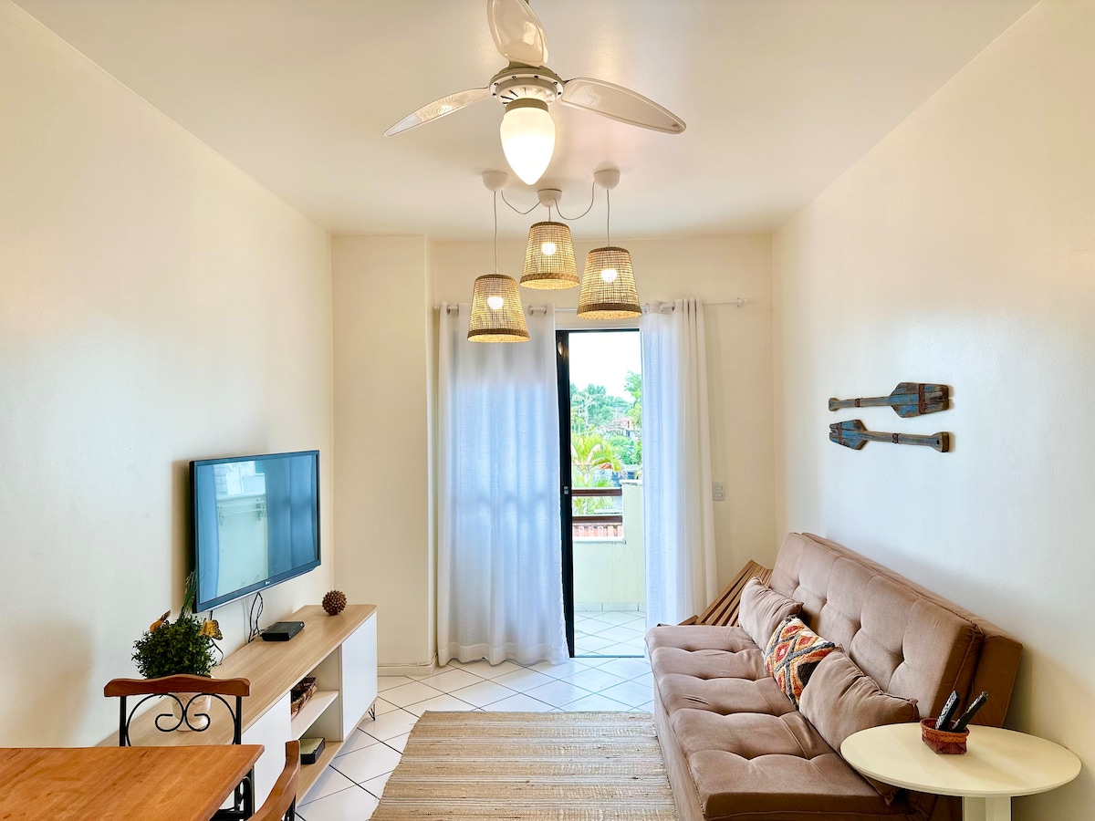 Reformado recentemente e decorado com charme, esse apartamento fica a passos do mar entre Jurerê Tradicional e Canajurê, em condomínio seguro e tranquilo. Ideal para quem busca sossego com acesso rápido ao agito de Jurerê Internacional. O espaço conta com quarto climatizado com ar‑condicionado, Smart TV, internet rápida e vaga privativa no condomínio. A decoração moderna, com toques da cultura local, cria uma atmosfera acolhedora e autêntica — perfeita para relaxar ou explorar a Ilha!