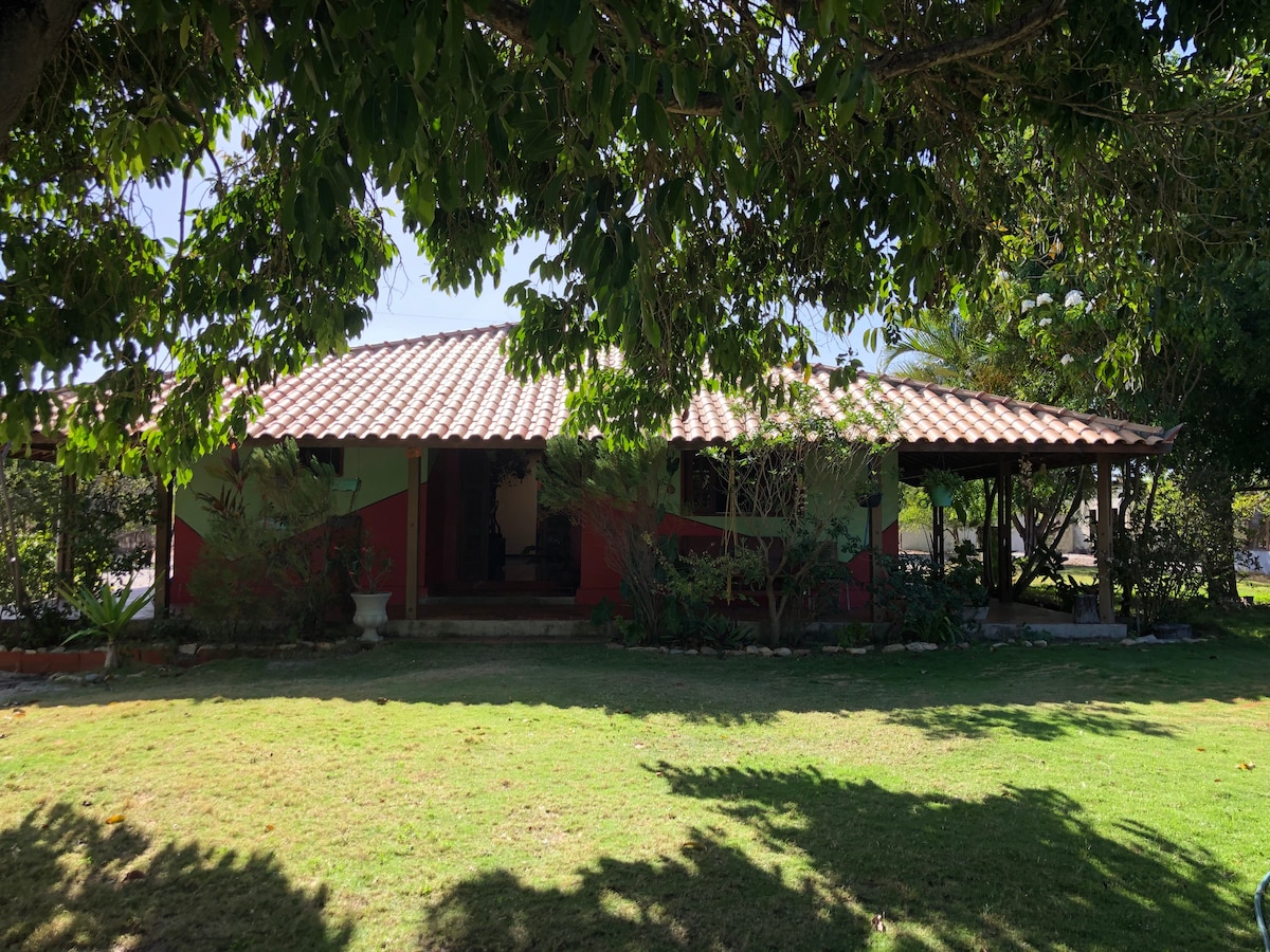 Aqui, você aproveita o cantar dos pássaros, a sombra fresca das árvores e a tranquilidade de um lugar calmo e pouco movimentado. São 3 quartos, sendo 1 suíte, cozinha americana ampla com armários, sala de jantar, sala, jardim de inverno, varanda para receber familiares e amigos, piscina, na garagem coberta, há vaga para um carro. Fica entre Canoa Quebrada e a praia de Majorlandia. Faça a sua reserva antecipada, e ganhe descontos ! Um recanto privilegiado para curti suas férias!”