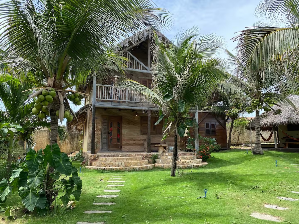Lugar único e tranquilo. 6 pessoas confortável (2 camas casal e 1 beliche). Máx. 8 ps. (+colchão e rede). Praia de Fontainha, 15 km de Canoa Quebrada, no alto de falésia. Vilarejo de pescadores com jangadas. Acesso asfaltado. Garagem 4 carros. Terreno 5.000 m², Varanda vista 180°. Hall, Piscina, gramado, 3 Churrasqueiras. Andar Superior: Loft, estar, jantar, cozinha, 2 quartos, 1 banheiro. Na areia da praia: Cozinha, campo bocha e malha. Mar calmo p/ banho. Quintal arborizado e espaço p/ Lual.
