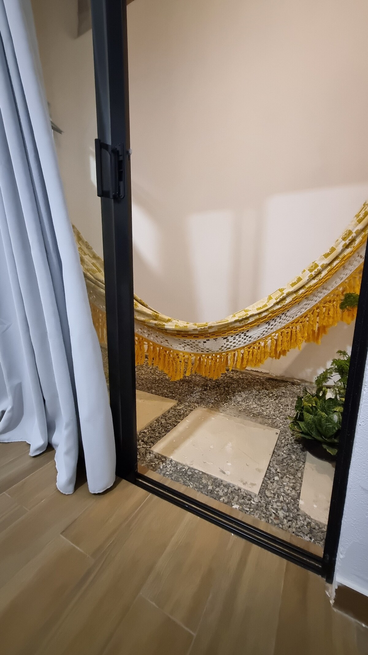 Apartamento térreo, quíntuplo, com cozinha nova e completa. Vistas para o mar e dunas. Quarto com cama de casal + solteiro e 2 camas na sala. Banheiro privativo. Tv tela plana 21", Netflix, ventilador de teto, ar condicionado, cofre, chuveiro elétrico, wi fi, rede na varanda. Comedor frente ao jardim.
