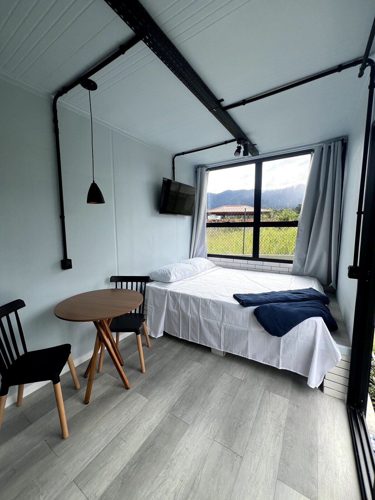 Stay in a unique container inspired by the water element! One of the 4 suites on the same property, with air conditioning, queen bed, kitchen and a small private garden, offers comfort and privacy. Also enjoy the common area with barbecue, pizza oven and pool table for leisure moments. Ideal for those looking for a simple, different and cozy experience.