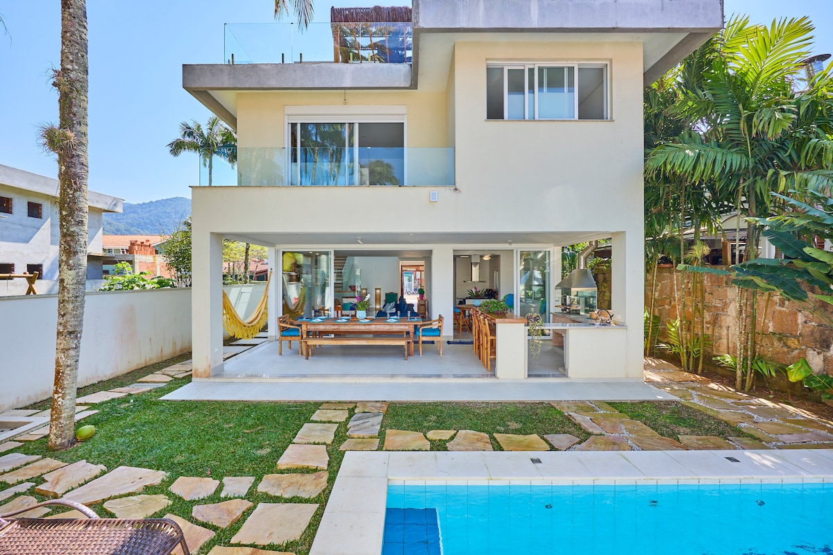 Descubra a melhor experiência ao norte de Ilhabela: casa moderna e térrea, no exclusivo Condomínio Pacuíba, com vista panorâmica e total privacidade. Acesso direto à praia. Ideal para famílias de 10 pessoas, não serão aceitos grupos maiores. São 4 suítes com ar-condicionado. Área interna com salas integradas, TV e cozinha bem equipada. A área externa conta com piscina aquecida de borda infinita aquecida, espaço gourmet, churrasqueira e fogueira. Ideal para momentos inesquecíveis e de desconexão!
