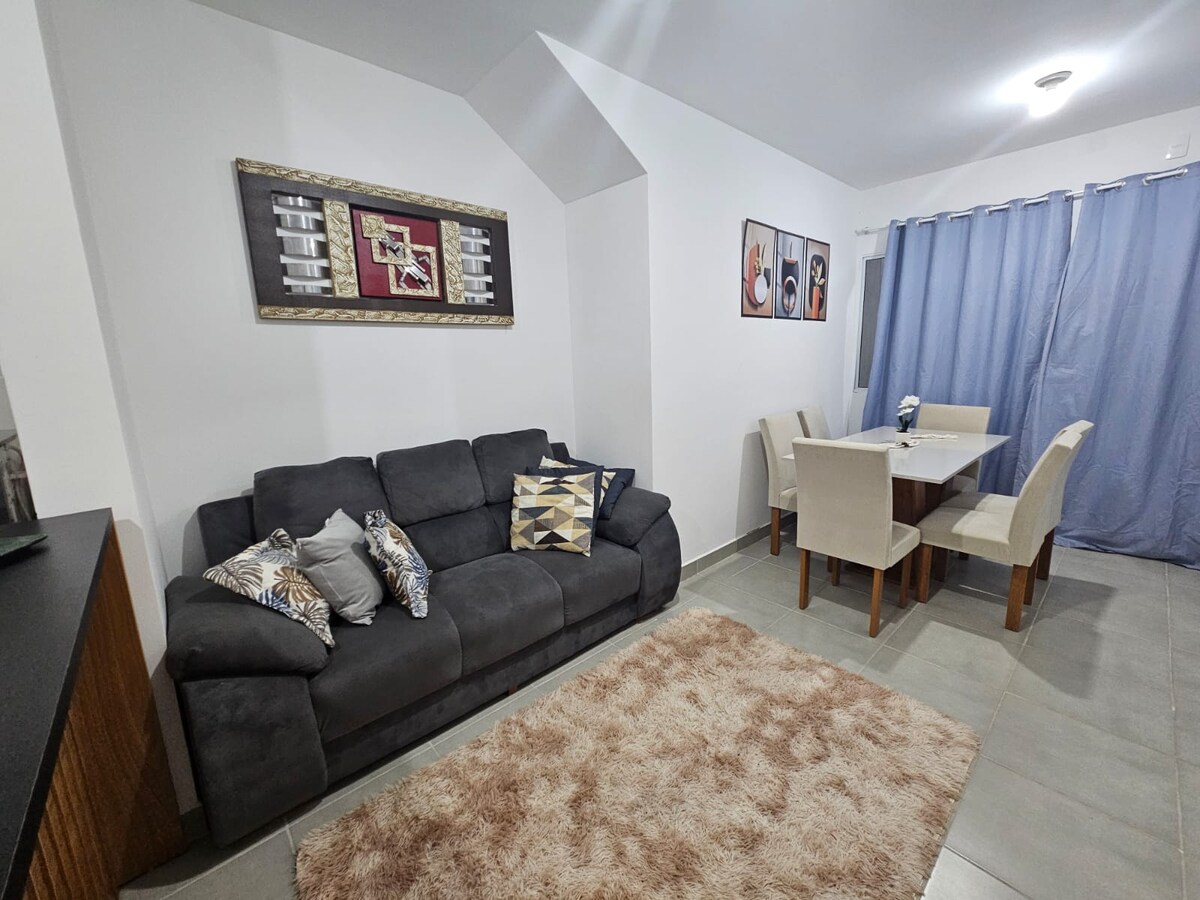 Uma casa completa no condomínio Monte das Oliveiras, em andar superior, com 1 suíte com ar que acomoda 4 pessoas, sala com ar, banheiro e sofá cama, cozinha completa, varanda e 1 vaga de garagem atrás do imóvel. O condomínio possui infraestrutura com portaria 24h, serviço de limpeza, sauna, piscina, hidromassagem, academia, churrasqueiras e local com redes. Incluída a limpeza de check-in. Limpezas adicionais c/trocas durante a hospedagem são tratadas na recepção. Favor deixar a casa como recebeu