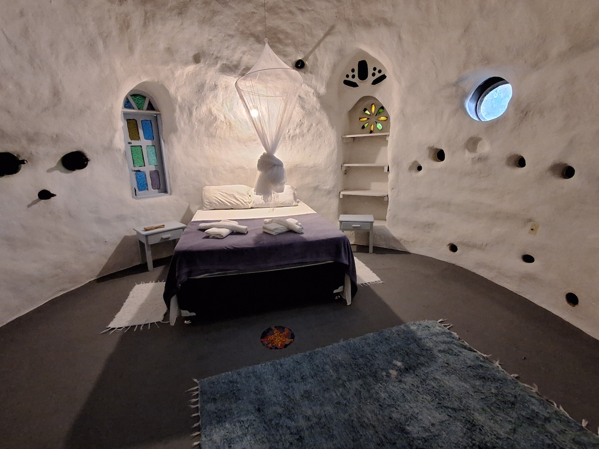 Em um espaço do nosso quintal em meio às árvores, construímos um chalé de SuperAdobe com varias mãos. O fato de ser uma construção natural faz com que ele tenha uma temperatura agradável o ano todo, além do astral super legal de dormir em um local redondo feito de barro. O chalé possui um dormitório com cama de casal, uma cama de solteiro e uma cozinha equipada com fogão, utensílios e frigobar além de um banheiro e varanda com rede.