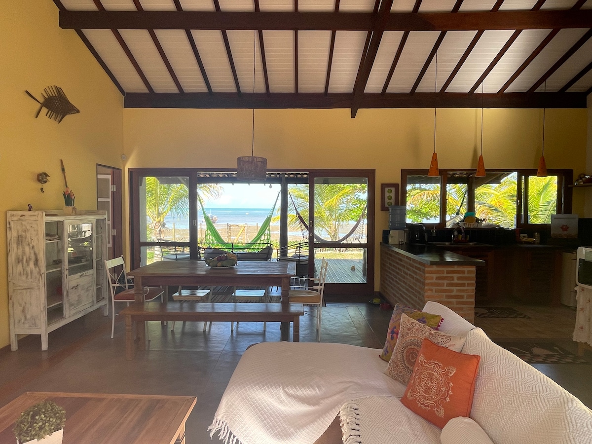 CASA A BEIRA MAR - PE NA AREIA, NO CENTRO DA VILA. TOTAL DE 04 SUITES E 05 BANHEIROS. TODAS AS SUITES COM AR CONDICIONADO. ACOMODA UM TOTAL DE ATE 16 PESSOAS. TAXA DE FAXINA 250,00 E LAVANDERIA 100,00 BANHEIRO EXTERNO, REDES, DUCHA EXTERNA QUADRA DE PETECA/ VOLEI AREA GOURMET C/ PIA, FOGAO INDUSTRIAL, GELADEIRA E CHURRAS