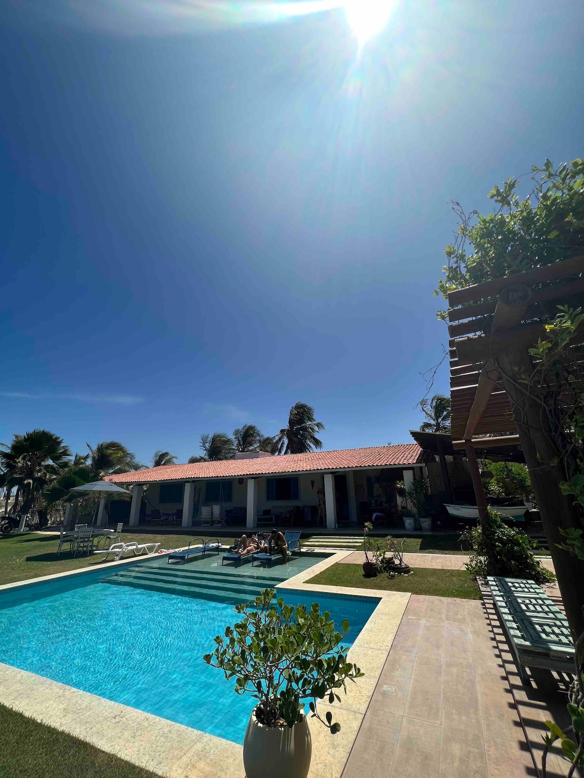 A beautiful beach house with free WiFi is available for short or long-term rent. The house is located in one of the prettiest villages in Ceará and is within walking distance from shops, markets, pharmacies and restaurants. Located right on the seafront and offers direct access to the beach and unbeatable sea views. Ideal for families and groups of friends who want to spend some days on the beach or celebrate a wedding or a child naming ceremony. Private parties are welcome.