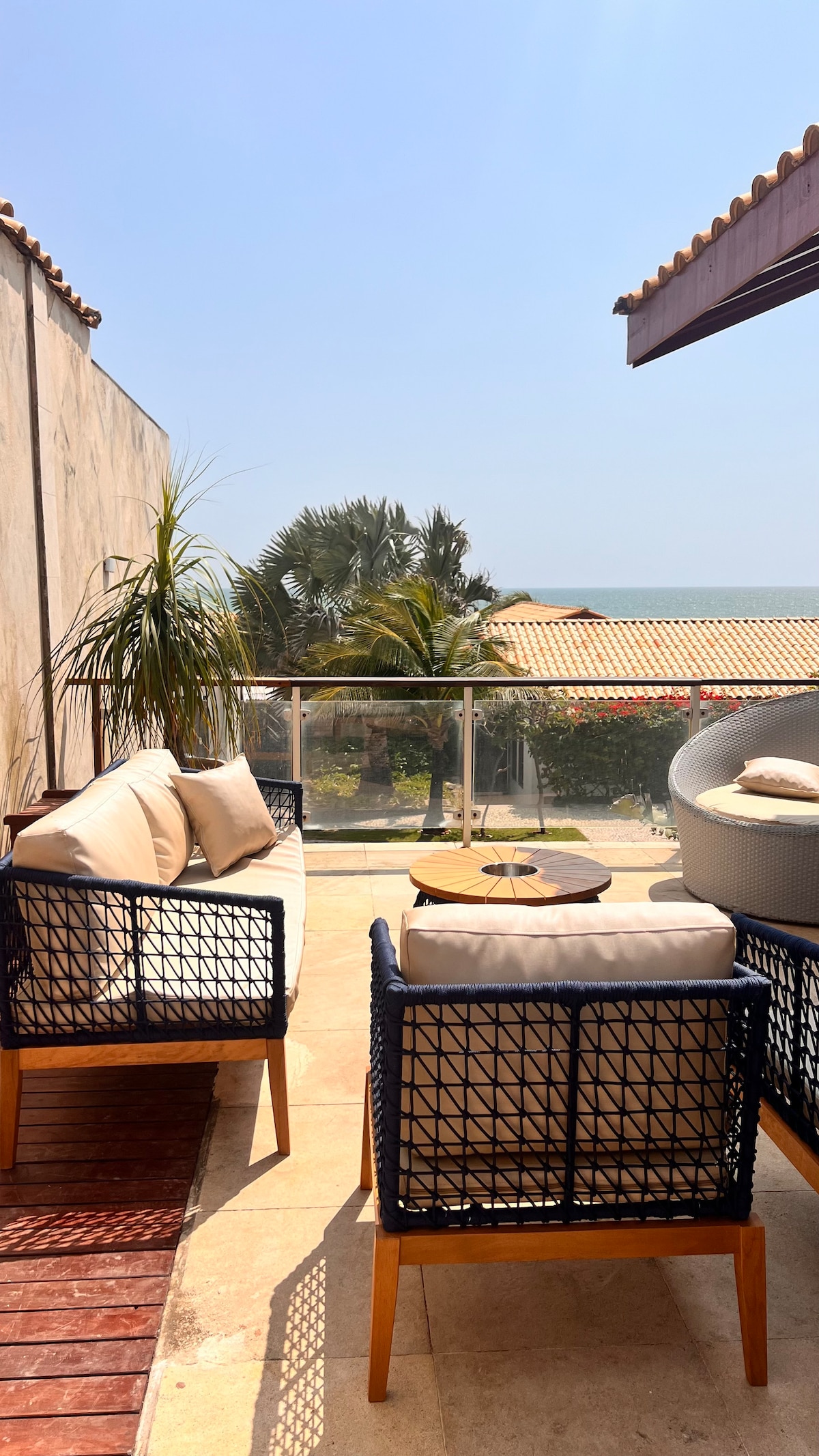 Apto novo e equipado. suite e dois quartos, banheiro e uma grande sala com cozinha integrada. Sala com TV, sofás, mesa, cadeiras, ar condicionado. Cozinha: Geladeira, fogão, forno-microondas, pratos, talheres, panelas, copos, sacras, cafeteira, sanduicheira. Encima tem um amplo Terraço com banheira de hidromassagem com água quente, churrasqueira portátil, cervejeira, banheiro, mesas, sofá, poltronas, puff, plantas, com vistas ao mar e as dunas. Condomínio tem piscina, estacionamento e segurança