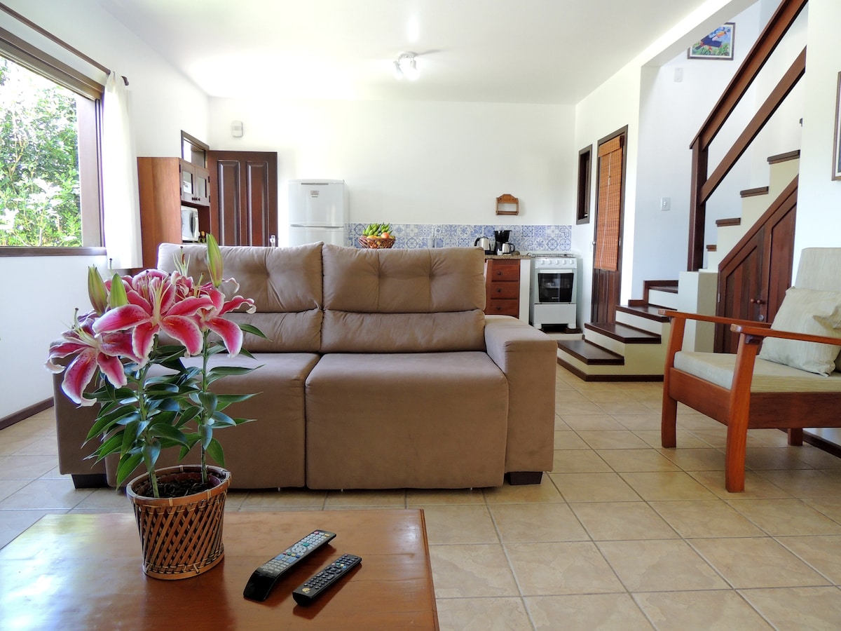 Amplia casa a 400 mts. de la playa y a 100 mts. del centrinho. Capacidad máxima para 6 personas. Acogedora y confortable. Excelente vista a la Laguna de Ibiraquera en el deck. Mirador en el punto más alto del morro con vistas al mar. Dormitorio principal en suite con cama matrimonial (sin A/C) , 1 dormitorio con 5 camas individuales y baño externo. Entrepiso con 1 cama doble. Living y cocina. Ducha exterior y parrilla. Deck externo. Estacionamiento privado para dos autos. Wi-Fi bueno y seguro.