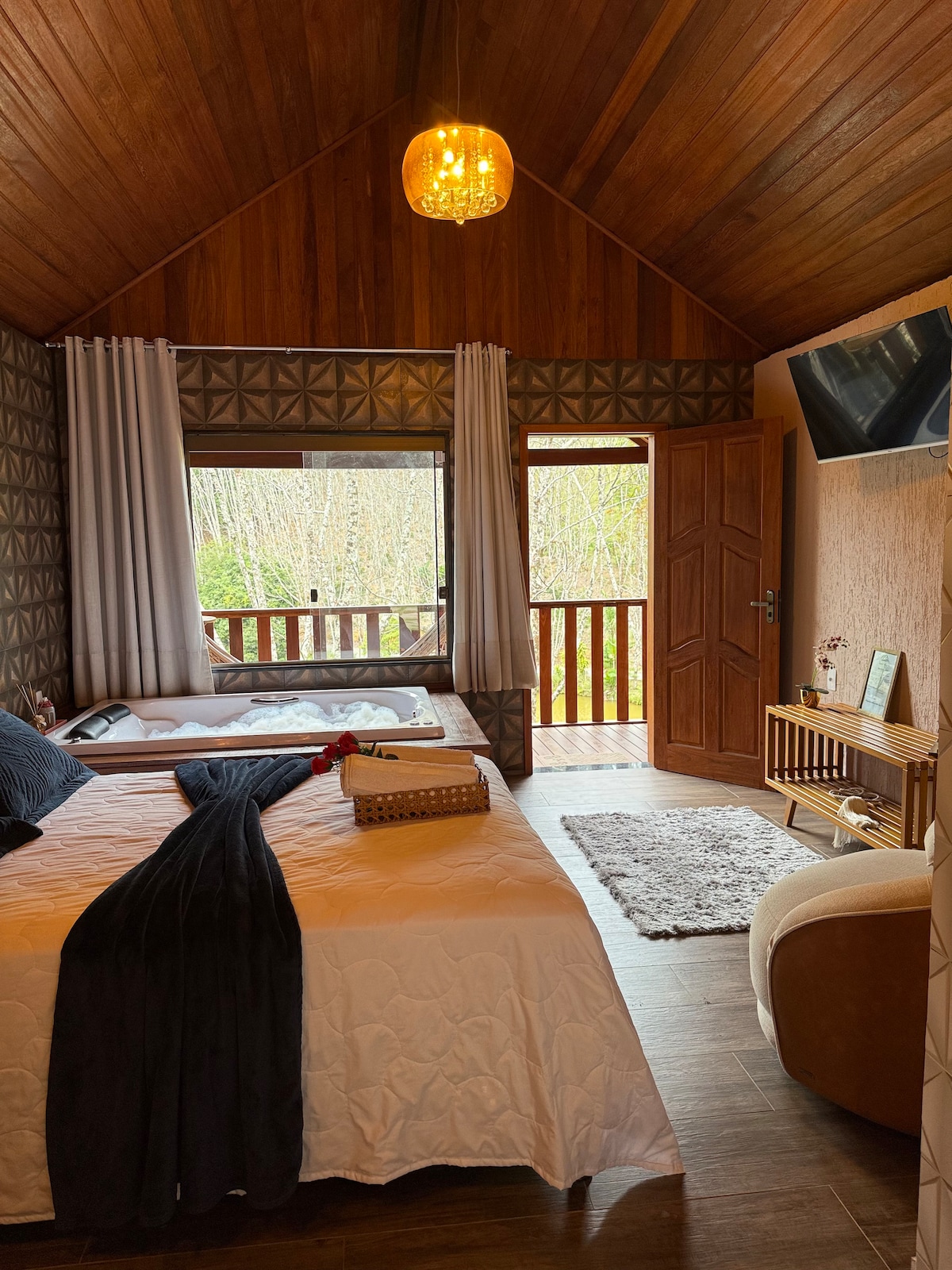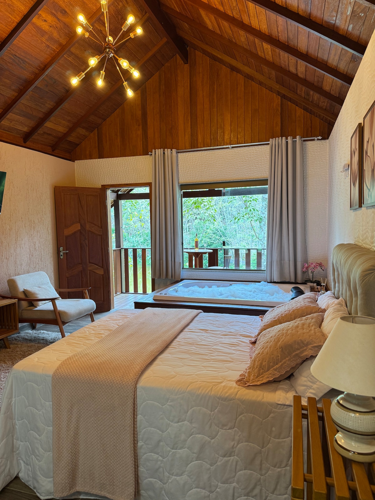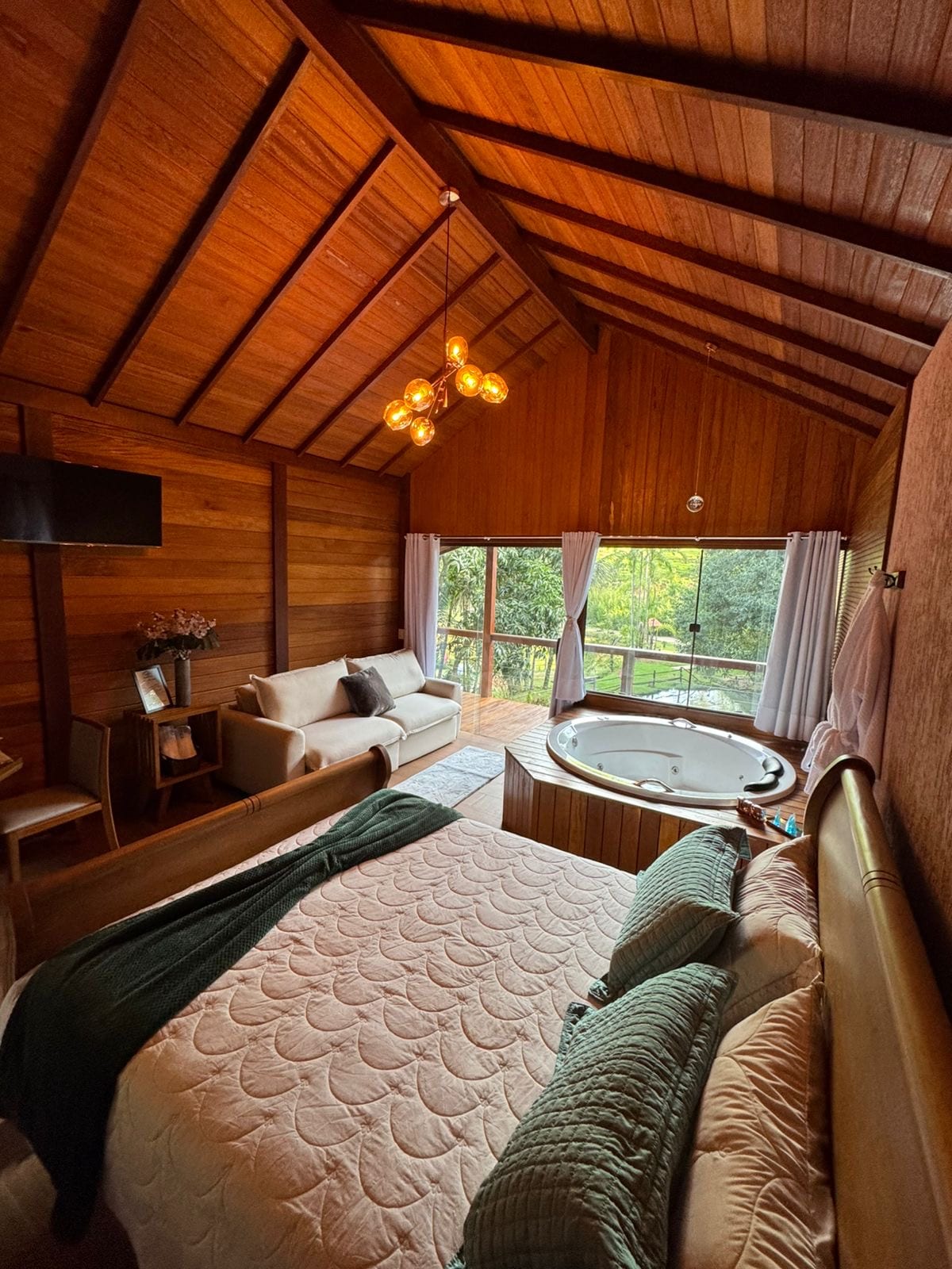 Nosso Bangalo tem duas suítes sendo uma suíte master com cama King size colchão Emma e banheira de hidromassagem ! Nossa segunda suíte possui cama de casal Nossa casa tem cozinha toda equipada , mesa ampla na sala , sofá cama de 3 metros na sala e smart Tv 55 com canais liberados. Na área externa você conta com uma ecosauna. Nosso espaço é todo equipado e pronto para você viver dias extraordinários, cercado de natureza você vai para as praias de Guarapari em 20 min e para a cachoeira em 5 min