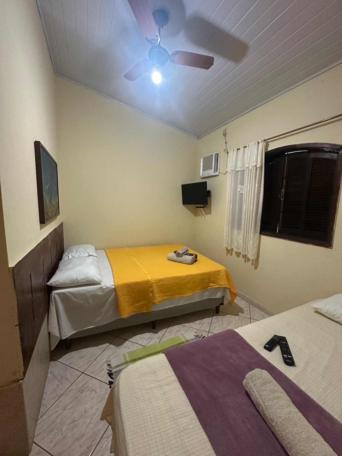 Nossas suítes são bem decoradas e contam com TV com Netflix, ventilador e ar condicionado. Oferecemos roupas de cama, toalhas e produtos básicos de higiene.