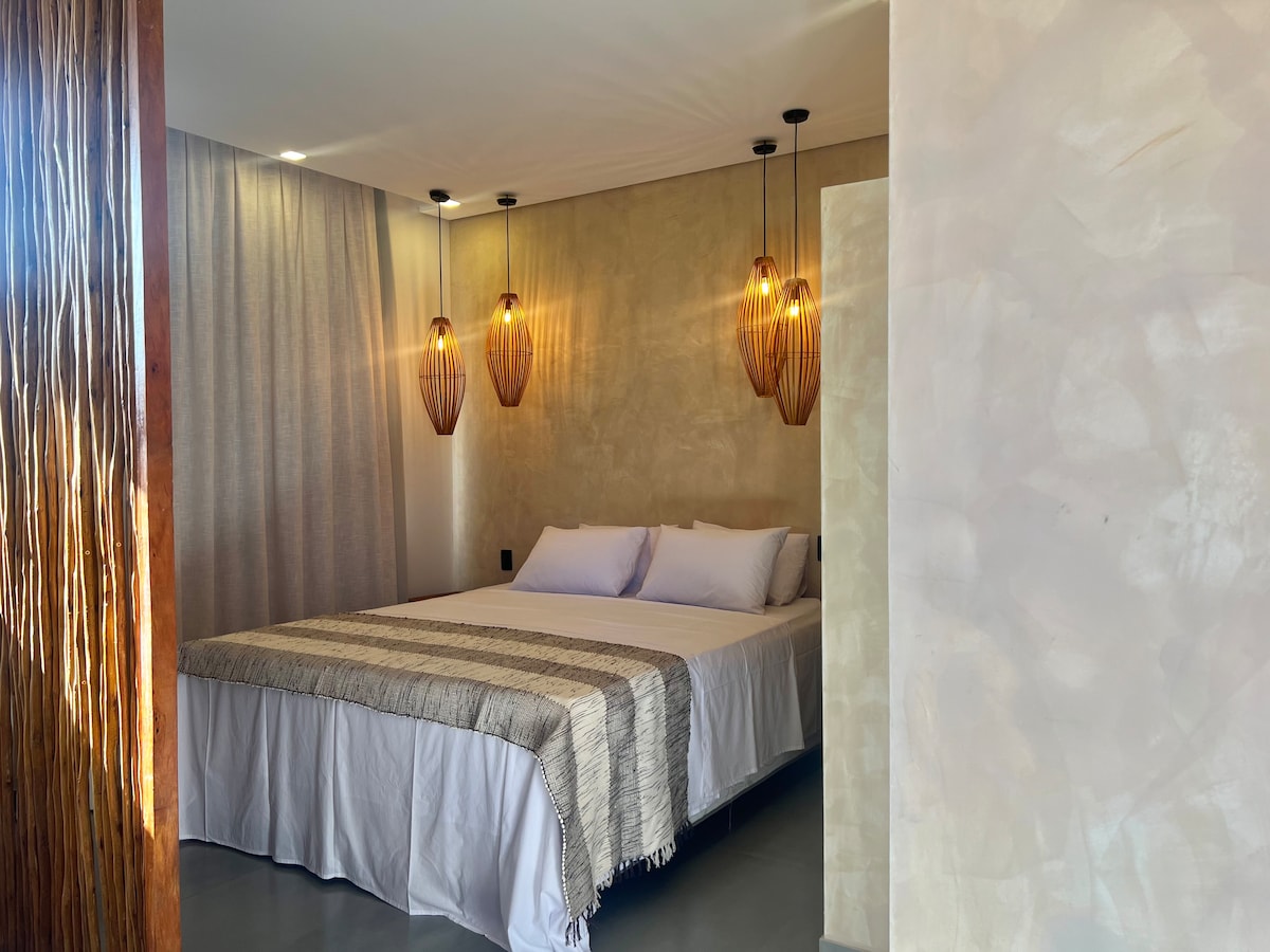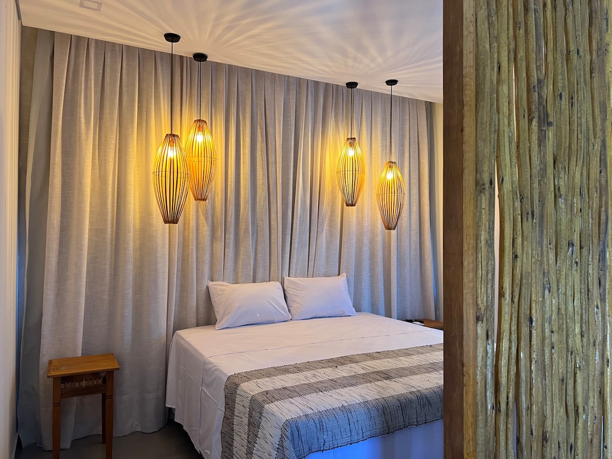 O bangalô, ideal para até quatro pessoas, a apenas 200 metros da praia. oferece um quarto com cama de casal, ar-condicionado Split, ferro de passar roupa, armário e uma bancada adequada para home office. A sala dispõe de uma bicama, smart TV e tbm ar-condicionado Split. A cozinha é equipada com geladeira, fogão, micro-ondas, airfryer, liquidificador e utensílios domésticos necessários. Além disso, o bangalô conta com uma varanda para momentos de relaxamento. O condomínio oferece piscina e Wi-Fi.