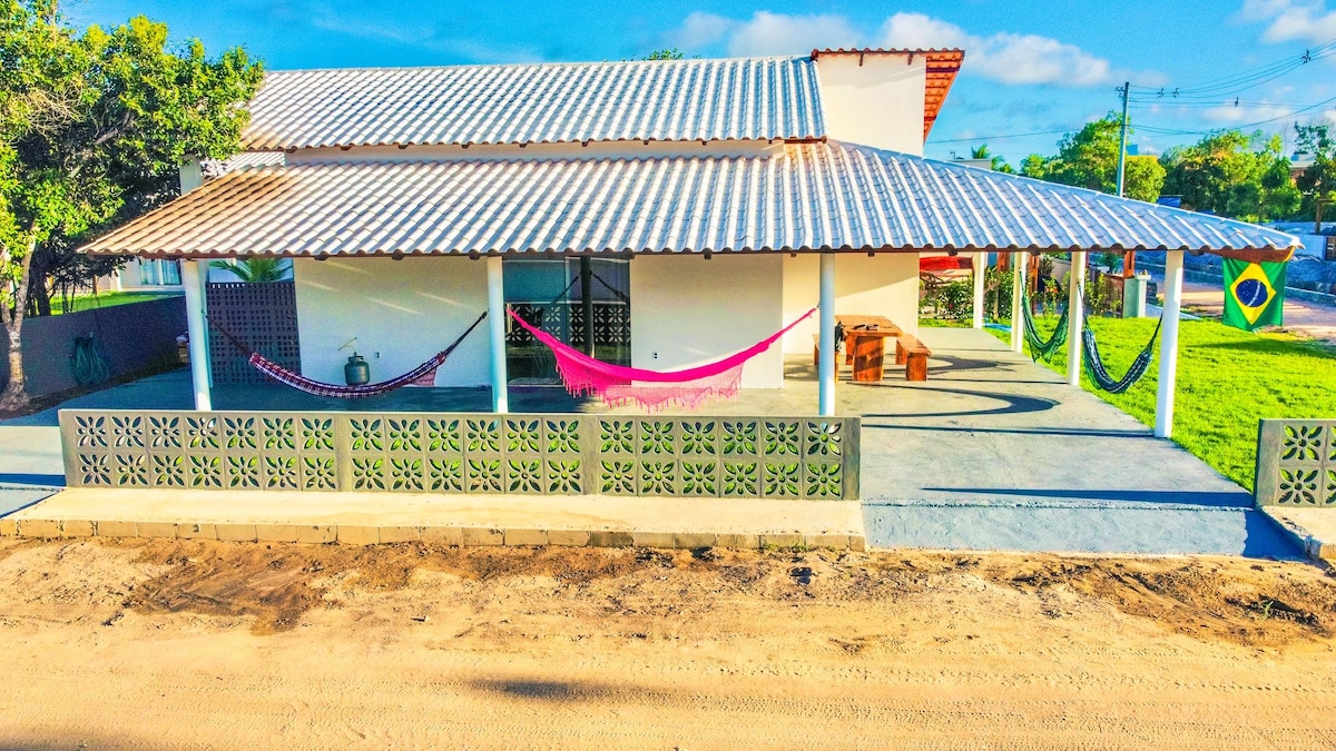 Casa ampla e confortável, próxima a praia, para curtir e descansar com sua família e amigos.Tendo 02quartos sendo um com suíte, todos com ar condicionado, 01 banheiro social,sala e cozinha conjugada é uma pequena área de serviço. A piscina e a área gourmet com churrasqueira é compartilhada. Condomínio fechado e segurança 24h. Temos mais 02 casas iguais a nossa no terreno.
