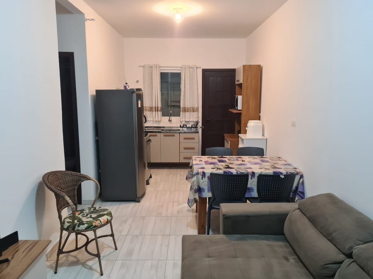 Aconchegante apto de 1 quarto com cama de casal e bicama. O espaço conta com sala conjugada de estar e jantar, cozinha completa, ventiladores de teto, sem ar condicionado, churrasqueira na varanda e 1 wc. Terceiro andar, sem elevador, oferece uma vista incrível e fica a apenas 40 passos da areia. 1 vaga de garagem compartilhada, e excelente localização, pertinho da principal avenida de Guaratuba/PR, com fácil acesso a restaurantes, mercados, farmácias, lojas e atrações da cidade.