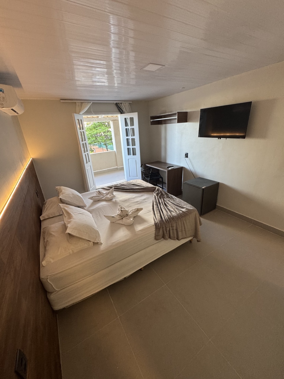 Na Pousada Ceará, em Porto das Dunas, esta suíte no andar superior com varanda e vista para o mar é perfeita para casais em busca de conforto e privacidade. A estadia inclui um delicioso café da manhã, ideal para começar o dia antes de explorar as praias e o famoso Beach Park. A suíte é aconchegante, bem iluminada e equipada com todas as comodidades essenciais, garantindo uma experiência prática e agradável durante sua estadia.
