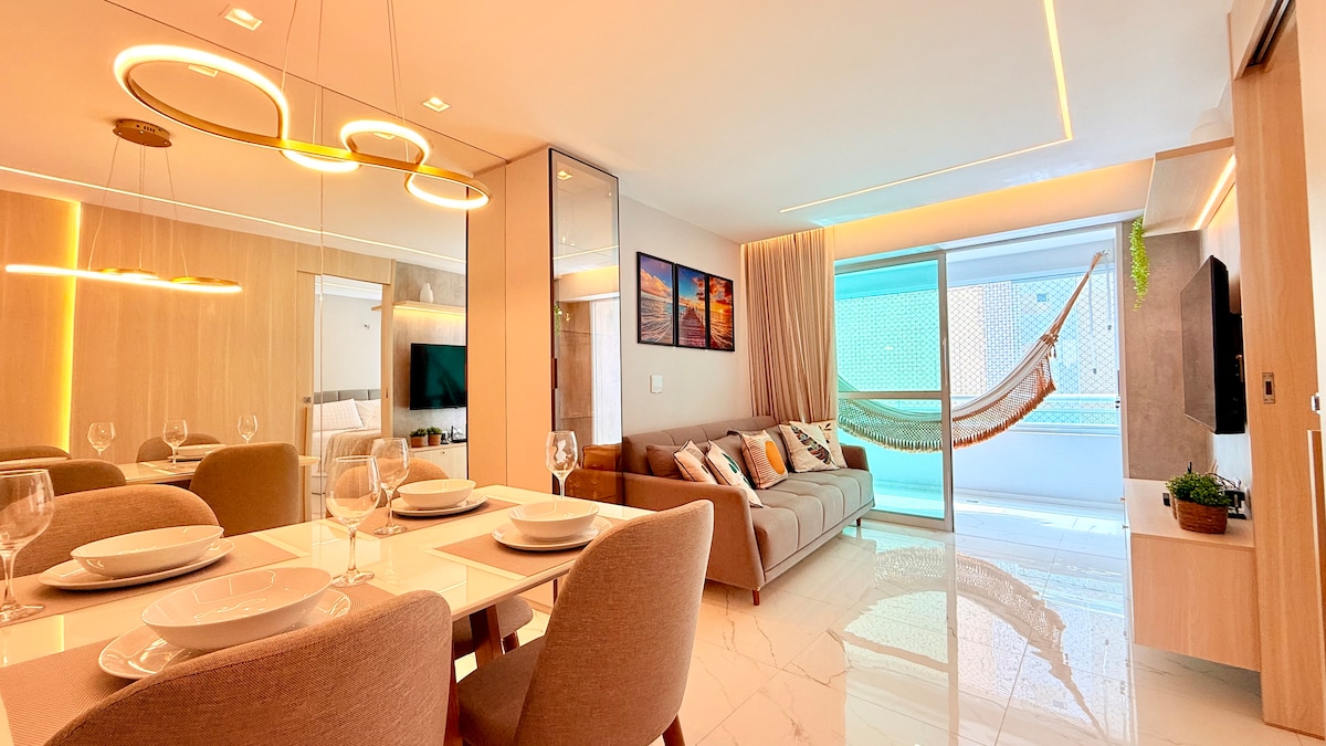 Apto de 3 quartos , sendo uma suíte,com uma varanda incrível COM VISTA PARA O MAR. Nosso espaço foi pensado para proporcionar conforto e bem estar aos nosso hóspedes. Conta com Smart TVs, Wi-Fi 200MB, Netflix, ar condicionados em todos os ambientes, água quente nos chuveiros, cozinha equipada com itens básicos que você precisa para o preparo de refeições em família. Possui, ainda, VAGA DE GARAGEM.
