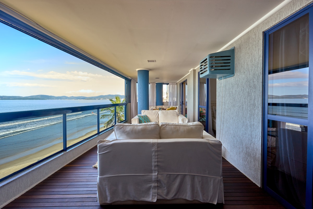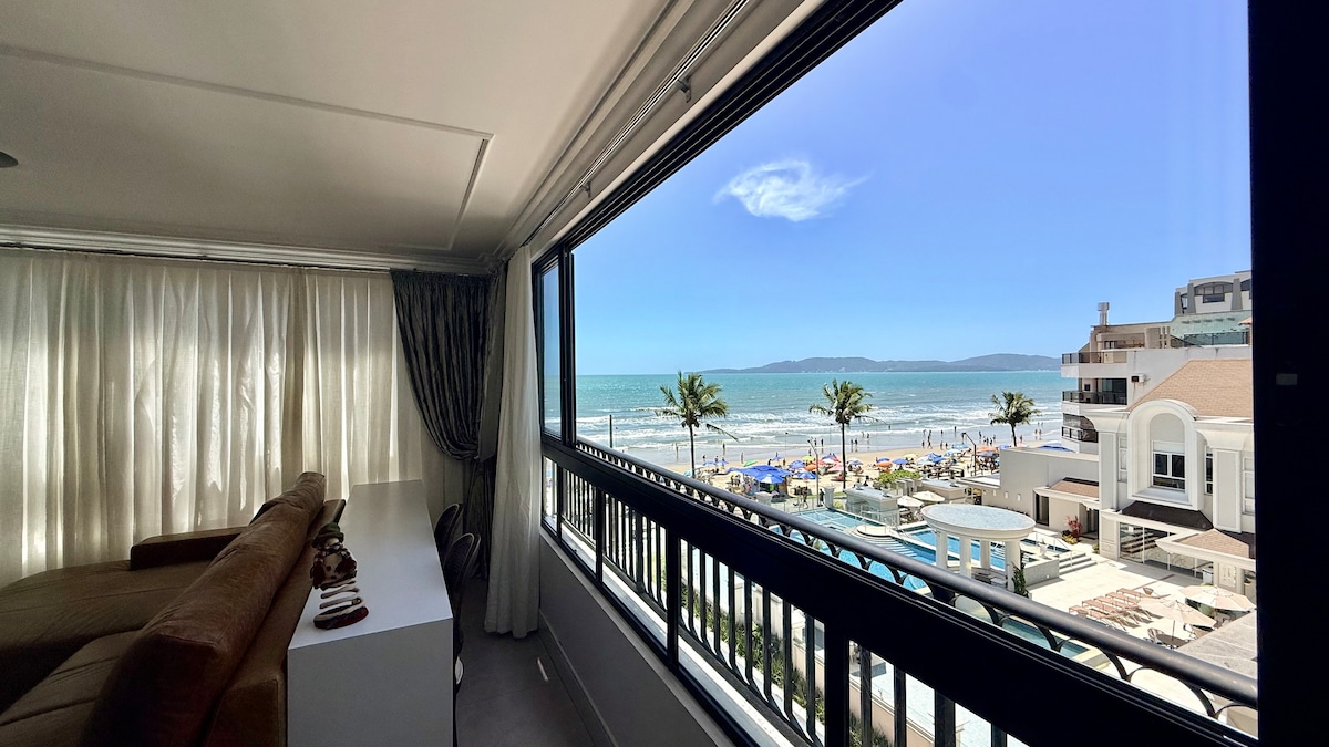 FRENTE MAR. São 4 quartos (Suite Casal, quarto Casal, quarto Casal com Beliche e Suite Solteiro). Tem uma varanda espetacular, ela tem poltronas e churrasqueira onde poderá ver o mar de uma vista de toda a praia de Itapema e Meia-Praia. O apto é perto de supermercados, Havan, restaurantes, bares, transporte público e do centro da cidade. Você vai amar nosso espaço porque fica na área mais tranquila da praia. Nosso apto é excelente para casais e famílias (com crianças).
