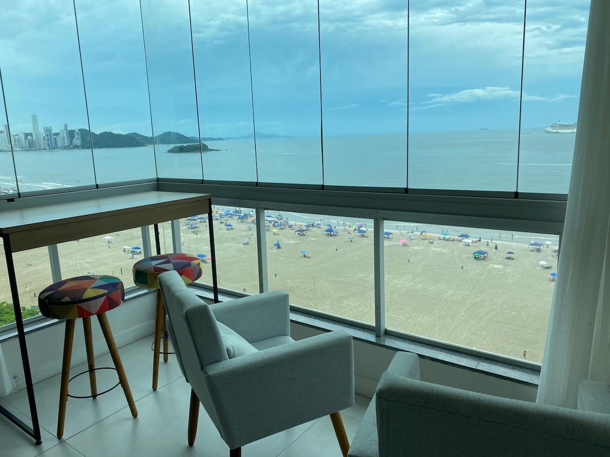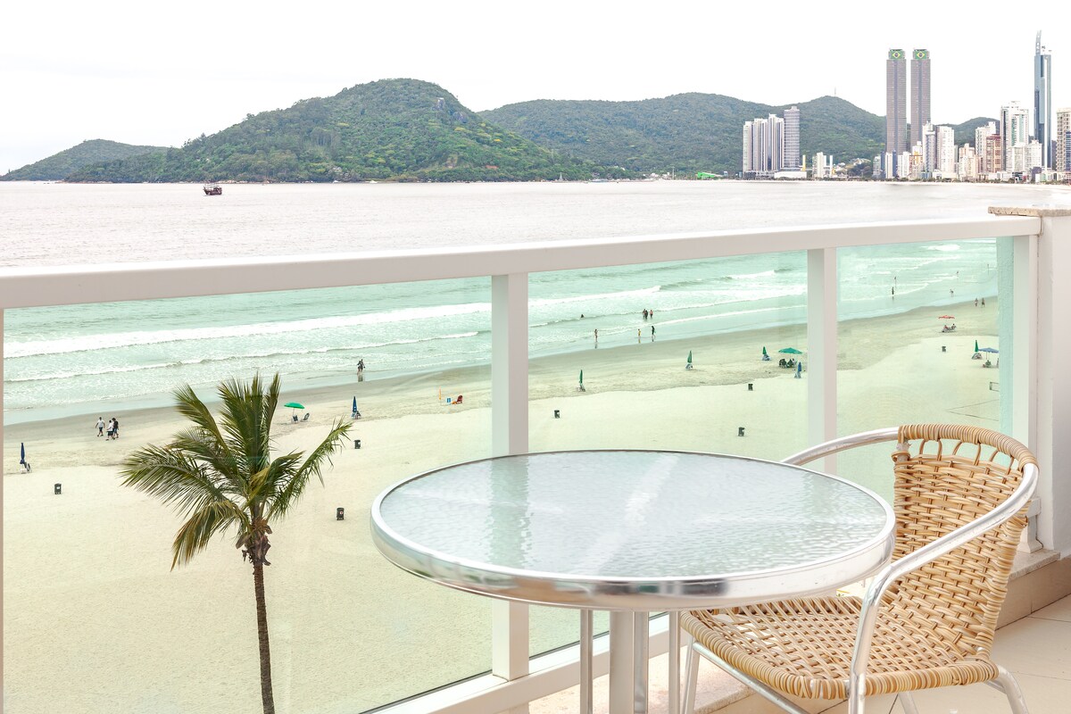 FRENTE MAR. São 4 quartos (Suite Casal, quarto Casal, quarto Casal com Beliche e Suite Solteiro). Tem uma varanda espetacular, ela tem poltronas e churrasqueira onde poderá ver o mar de uma vista de toda a praia de Itapema e Meia-Praia. O apto é perto de supermercados, Havan, restaurantes, bares, transporte público e do centro da cidade. Você vai amar nosso espaço porque fica na área mais tranquila da praia. Nosso apto é excelente para casais e famílias (com crianças).