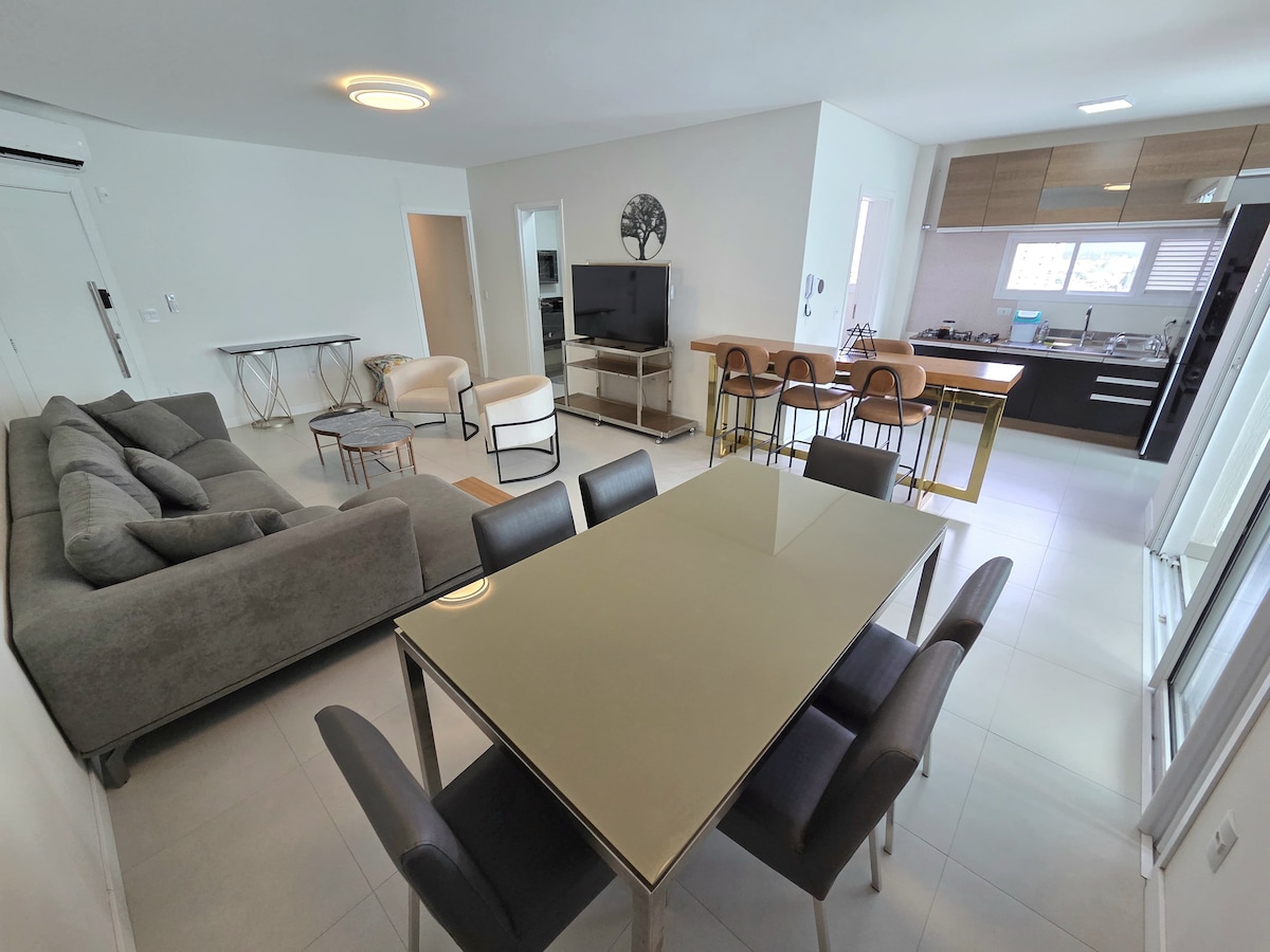Incredible apartment in Balneário Camboriú, with beautiful views of the entire beachfront. Space with a suite and two bedrooms with private bathroom, large living room, equipped kitchen and balcony facing the sea. Living room and bedrooms recently renovated and air conditioned, high quality mattresses, new furniture and fixtures. Three private and covered parking spaces. We provide bed linen for all beds and one bath towel per guest.