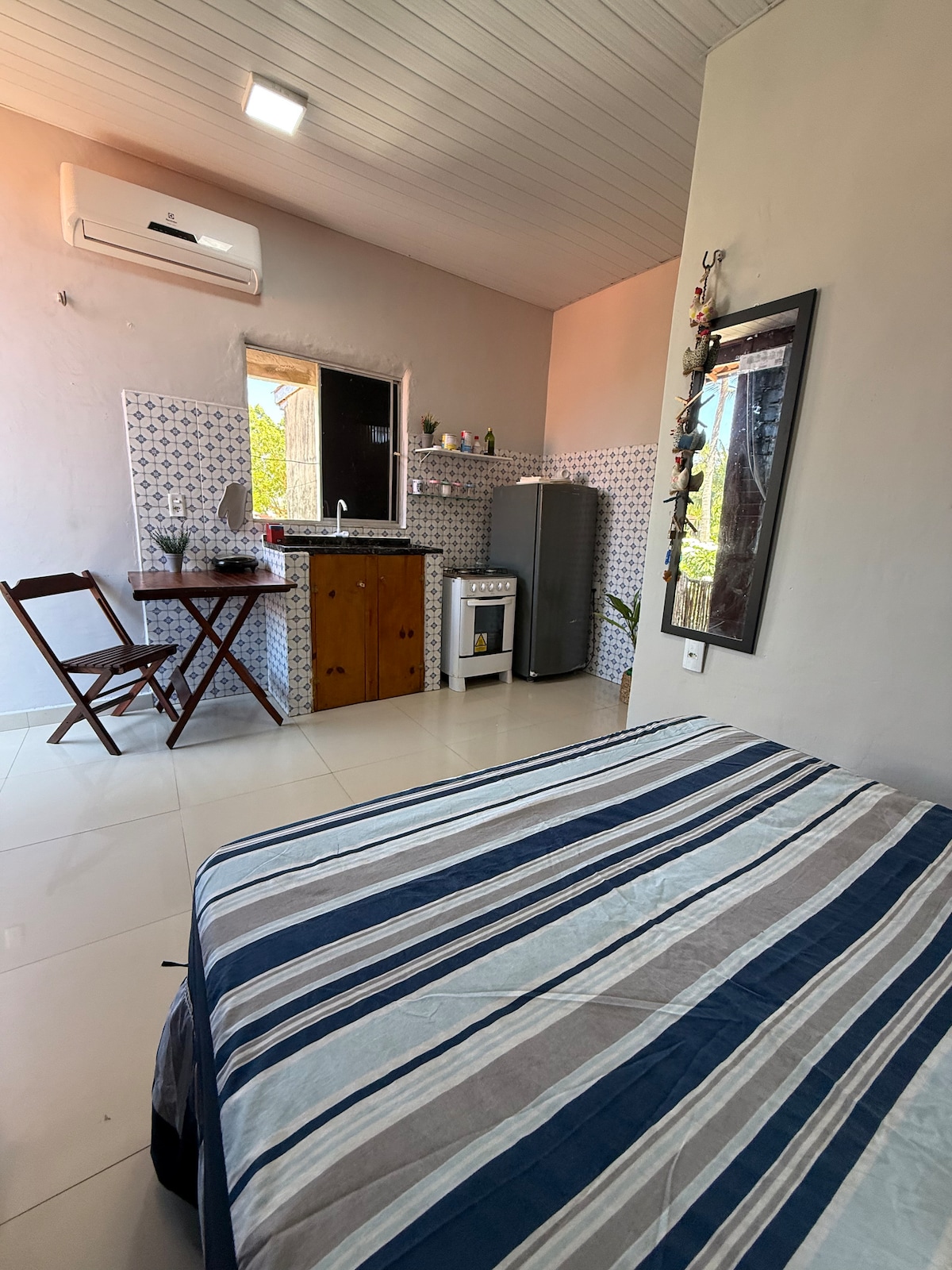 Casa estilo Bungalow Frente Mar! Vista privilegiada para a Beira Mar da Barrinha. Comporta 4 pessoas confortavelmente. Sala com mesa de Jantar e Sofá para home office, Ótimo Wi-fi disponível. Cozinha equipada com Fogão, Forno, Geladeira e utensílios. Suíte espaçosa com Ar Condicionado, armários, cofre, 1 cama Queen e 2 camas de Solteiros, Bancada do banheiro ampla. Água quente no banho e privacidade. Varanda Coberta com Rede para descanso e móveis externos para um Bom Café/Almoço Vista Mar.
