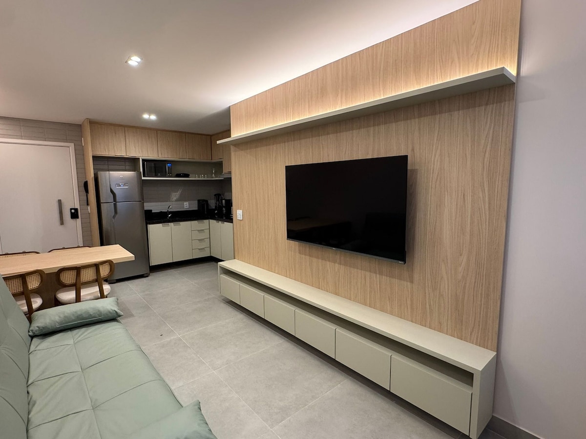 Lugar perfeito para quem busca conforto, praticidade e uma experiência à beira-mar. O flat possui um quarto com cama de casal, bicama de solteiro e armário. A sala de estar conta com sofá-cama (para até 2 pessoas, adultos ou crianças), TV e uma cozinha completa, equipada para preparar suas refeições com praticidade. O destaque é a área externa privativa com piscina, ideal para relaxar após um dia de praia.