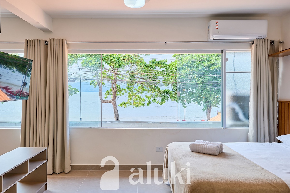 Apartamento novo/reformado, com vista incrível para o mar na melhor localização de Ubatuba. Perto de tudo e ao mesmo tempo em meio a natureza. 1 quarto com cama de casal e vista para o mar Sala integrada com a cozinha Piscina no condomínio. Ar condicionado Wi-fi rápido de 200mb Vaga de garagem Portaria 24h Fica na Prainha do Matarazzo e a 5 minutos da Praia do Perequê-Açu. Moderno e com uma vista paradisíaca. Por estarmos próximos ao Café de La Musique, pode ter barulho nos finais de semana.