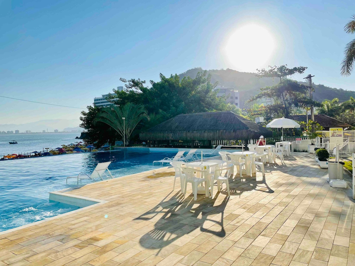 Relaxe com toda a família neste resort de luxo. A suíte tem o privilégio da vista para o mar direto da cama. Assim, a praia é a primeira coisa que verá ao abrir os olhos, além do prazer de dormir ao som das ondas quebrando na areia. Nade na piscina, enquanto vislumbra o azul do mar. Vá e volte da praia várias vezes ao dia, sem necessidade de pegar carro e enfrentar trânsito. É a praia com melhor infraestrutura da cidade, com mercados, restaurantes, padarias, farmácias bem pertinhos de você. :)