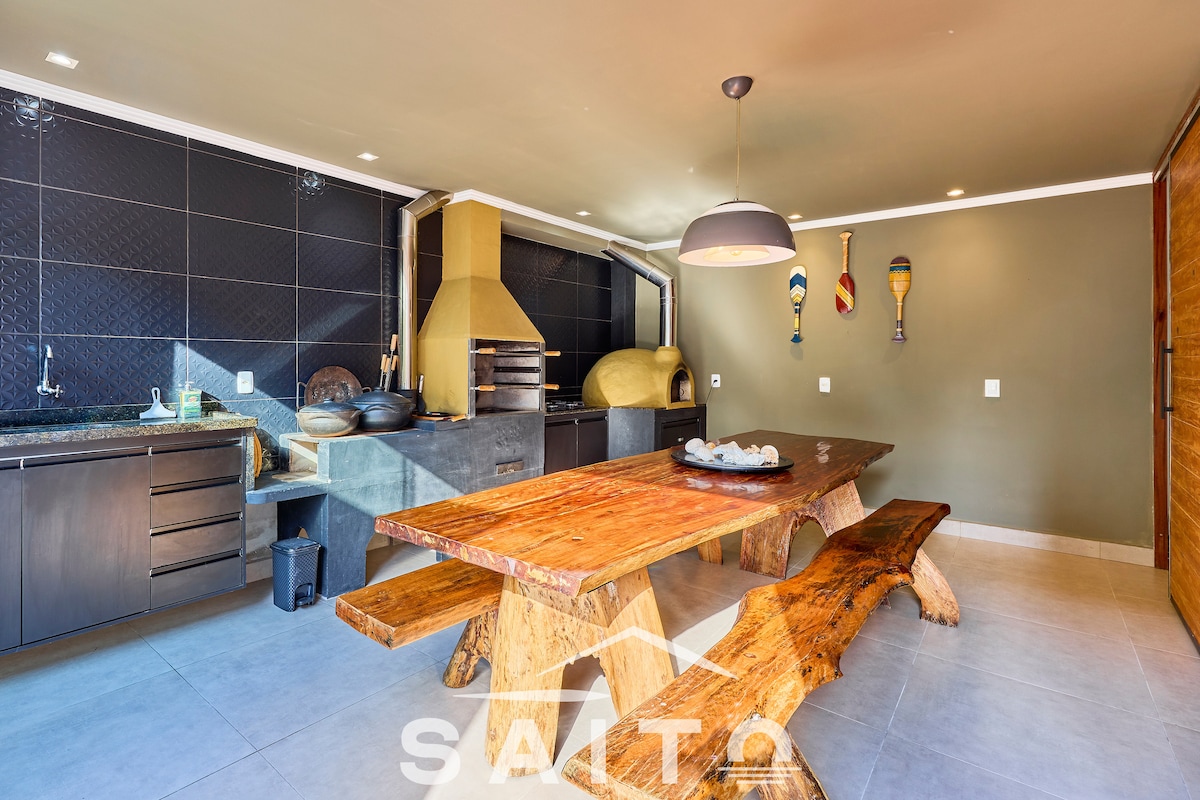 Somos PET FRIENDLY! A casa está a 01 quadra (100m) da linda praia do Sape dentro de condomínio (perto da Lagoinha). A casa tem 4 quartos (2 suítes) + mezanino. Sendo 01 quarto e banheiro no térreo. Total = 5 banheiros Para lazer tem piscina, churrasqueira, forno de pizza, jardim com redes. Condomínio de fácil acesso ao lado da praia (não precisa atravessar a pista). Chegando lá, não precisa de carro, pois a 5 minutos a pé tem supermercados, farmácias, mercearia, etc A 20 min a pé tem cachoeiras!