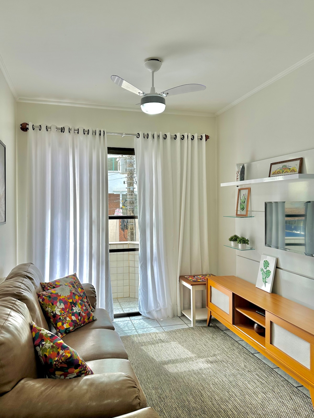 Apartamento aconchegante de frente para o mar. (50 metros) Linda vista do nascer do sol, da sacada e janelas. Praia familiar, ótima para crianças, tendo a opção de surf (lado esquerdo) e caminhada até o fim da praia (lado direito) para pescar, ver tartarugas e animais marinhos. Várias opções de lazer, entre elas: Banana-boat, passeios de escuna até as ilhas próximas. Redondeza com boa estrutura de mercados, farmácias, quiosques e restaurantes próximos, etc. Não precisa usar carro.