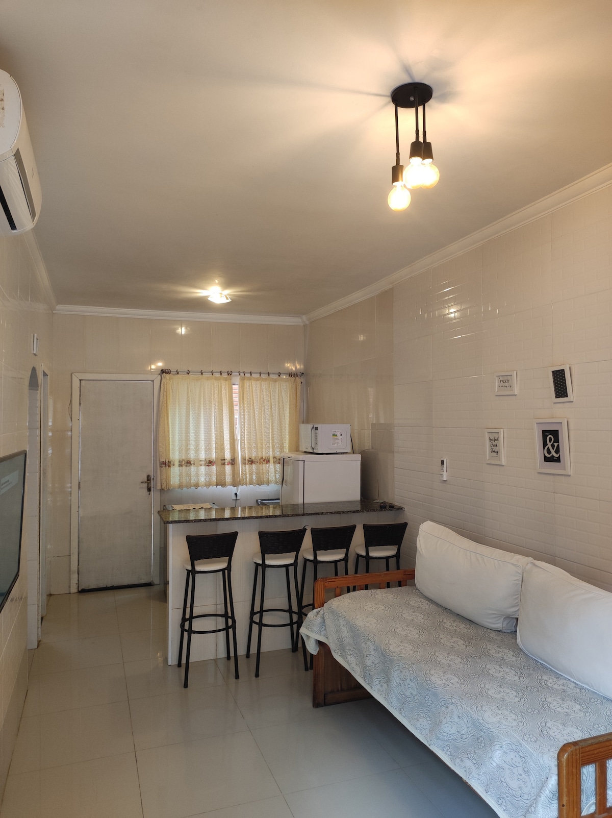 Apartamento de 1 dormitorio com ar condicionado, cama de casal, closet. sala/cozinha acoplada, cozinha mobiliada e equipada com geladeira, fogão, micro-ondas armário, mesa com 4 cadeiras e utensilhos: pratos, talheres, copos, taças, cafeteira nexpresso (necessário levar capsulas compativel ) Sala com sofá cama, Smart TV 40 polegada.